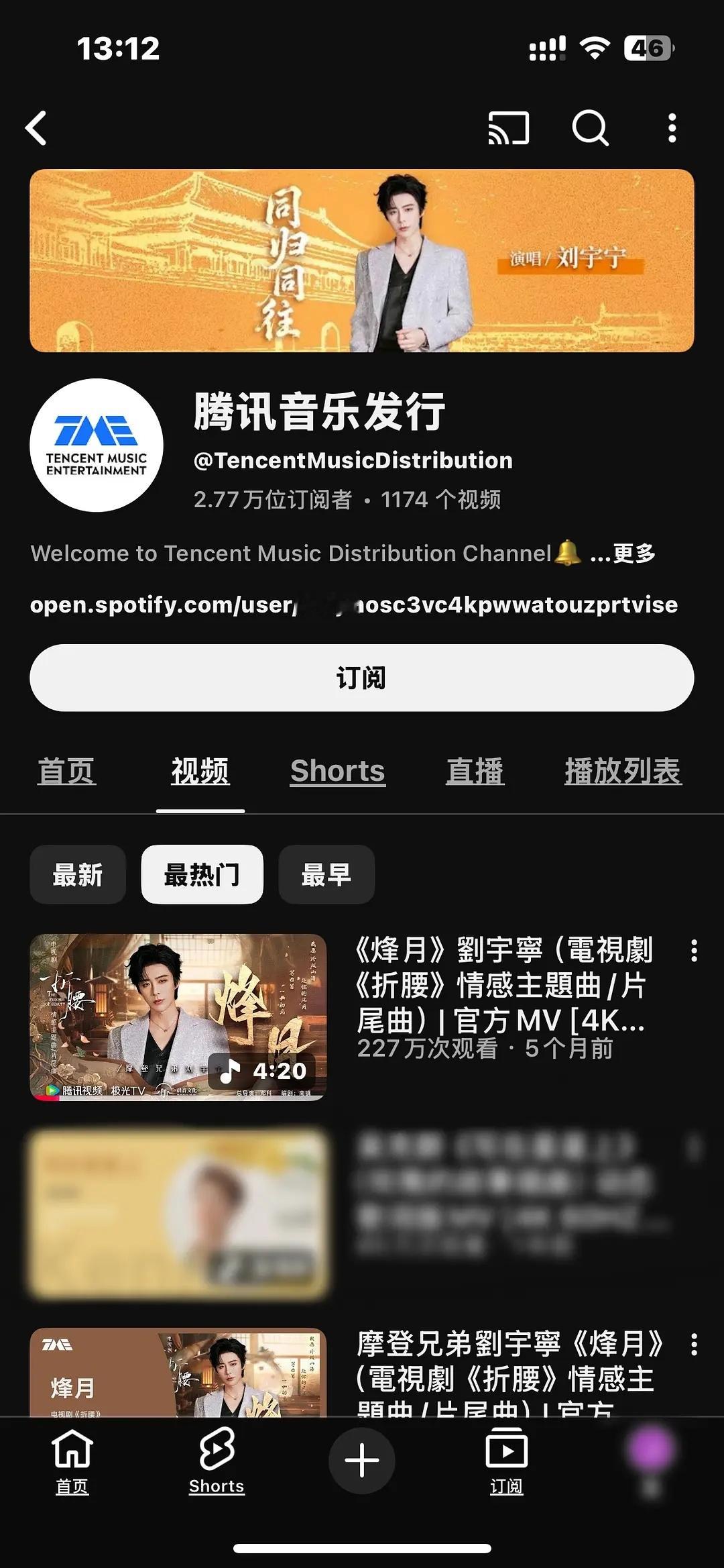 刘宇宁海外双平台霸主油管的爱奇艺慢综艺频道和腾讯音乐频道,刘宇宁的歌/舞台都是播