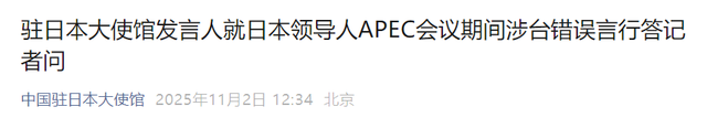 11月2日,中国驻日本大使馆发言人就日本领导人APEC会议期间涉台错误言行答记者问。