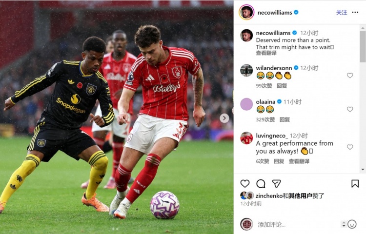 内科-威廉姆斯社媒晒出比赛照片,配文调侃曼联蓄发哥:“我们本应得到不止一分,理发还得再等等。”