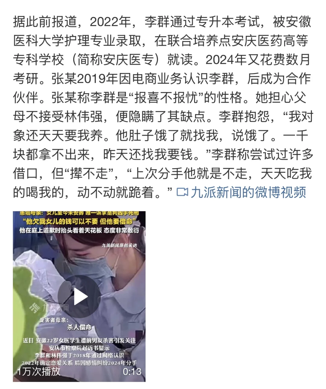 📍 受害者:李群,22岁,安徽医科大学护理专业专升本学生,案发时正在备战考研。