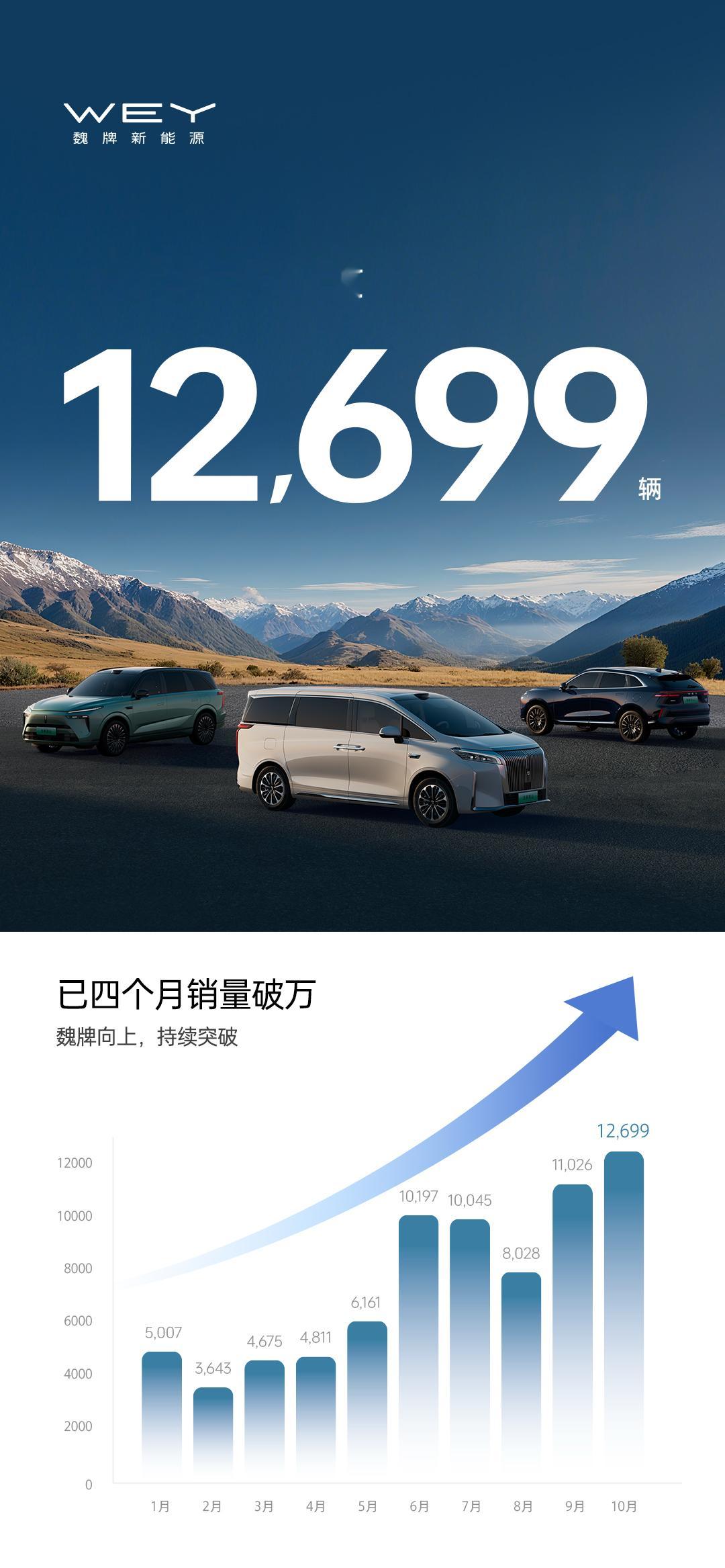 魏牌10月销量12,699辆同比增长96%,创年度新高。魏牌全新高山月销首破10