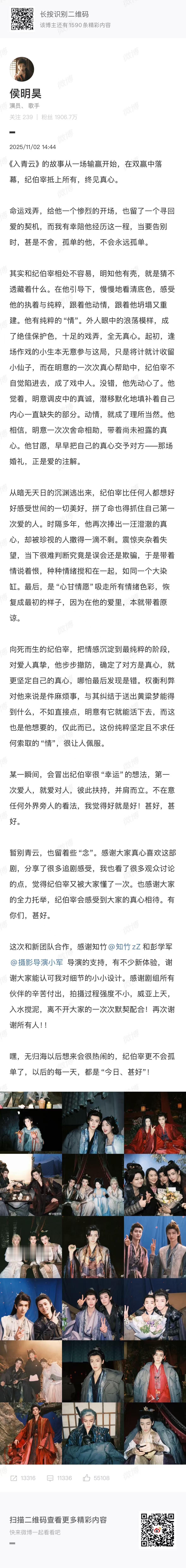 《入青云》今日落下帷幕,侯明昊用长文告别整部剧,同时发文告别纪伯宰,文字中透露出