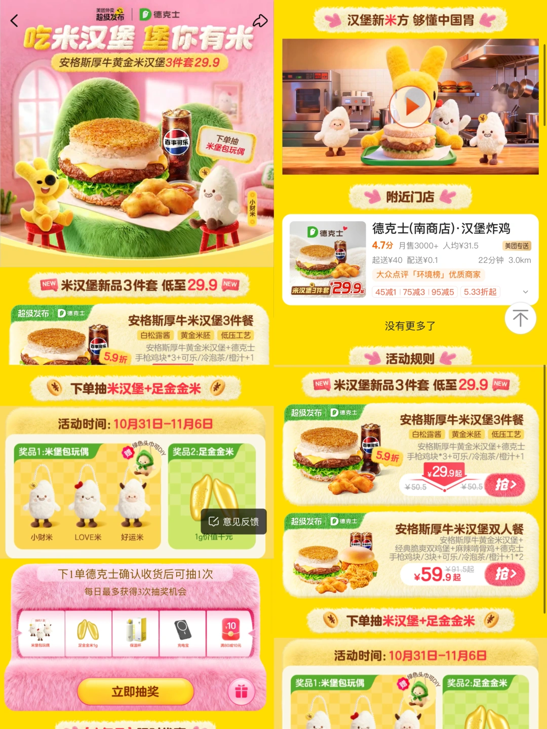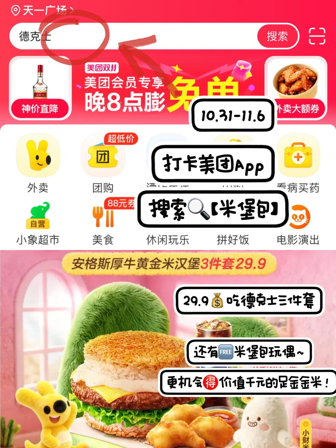 ✔️10.31-11.6 上美团外卖🔍【米堡包】买德克士任意产品,还有机会抽价值千元的足金金米!