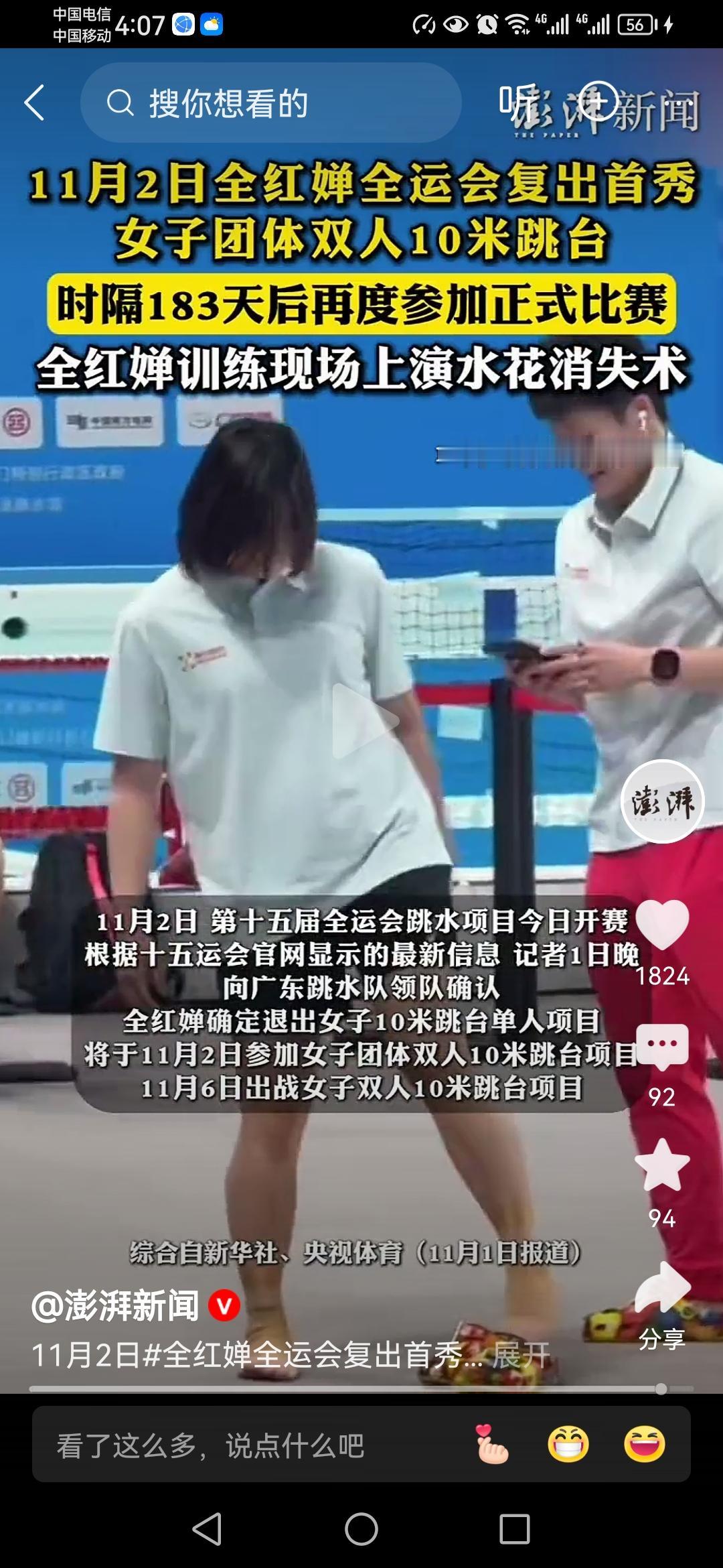 时隔半年再重新出发! 全妹肉眼可见地胖了!但她的技术底子还在,在训练中也屡次能够完成“水花消失术”!很可惜,这次在广东主场作战的全运会,全红婵意外地没有报名参加“单人”项目的比赛,而只是参加十米跳台双人还有团体赛,这难免让人很多喜欢她的人,有点遗憾和可惜啊! 半年没有参加正式的比赛,对于任何一个职业运动员来说,要找回自己的巅峰状态都是非常难的,相信这次全妹没有报名参加个人赛,肯定是经过教练团队进行全面评估的。其实也有两个原因。 一是希望不要给全妹那么大的压力,毕竟此前的伤病导致全妹一直都在养伤加上183天没有任何的比赛,带着这样的压力上场的话,要争冠军也确实有难度。 二是广东跳水队也在培养自己的“下一个全红婵”,所以这次全运会也会有其他的广东队员参加单项的比赛,这是一个非常好的锻炼机会。 无论全妹取得什么样的成绩,她已经不需要所谓的成绩来证明自己了啊!
