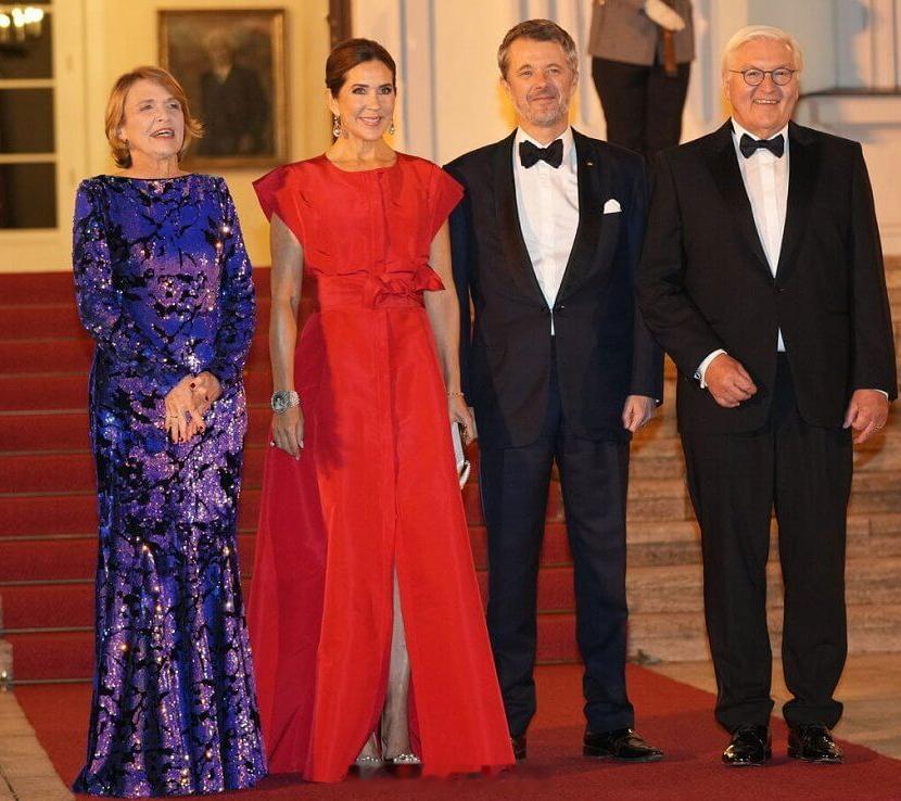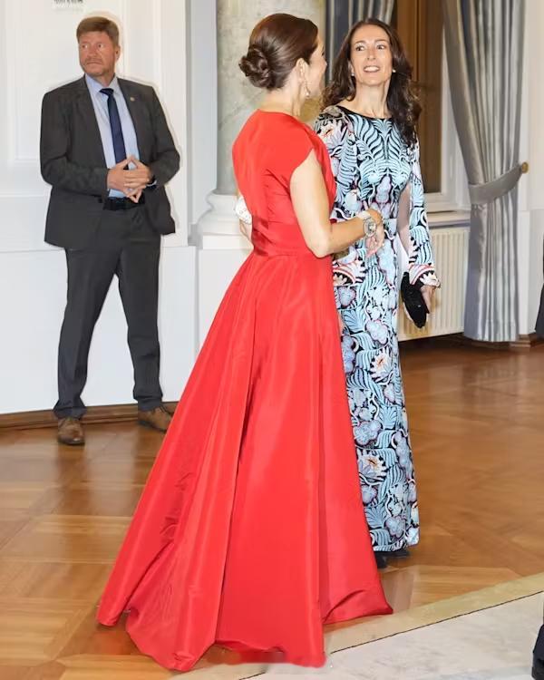 撞撞更精神 上周在ZF接待晚宴上,挪威王储妃梅特穿了条来自Carolina Herrera的红色长礼服。跟去年丹麦王后玛丽在德国北欧使馆周年庆接待晚宴上穿的是同款