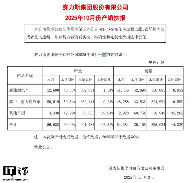 IT之家11月2日消息,赛力斯刚刚发布了最新的10月产销快报。2025年10月,新能源汽车产量52600辆,同比增长46.58%;销量51456辆,同比增长42.89%。