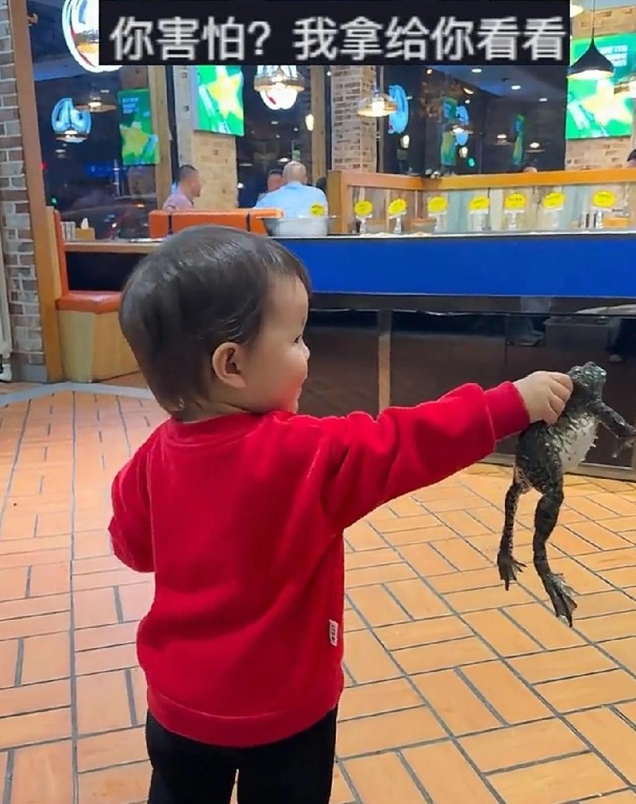 11月1日,辽宁。萌娃跟妈妈去饭店吃饭,看到门口生鲜区有各种鱼,塑料箱子里面还有牛蛙。萌娃被牛蛙的萌态吸引了,只见一个个牛蛙坐在水里,眼鼓鼓的往外瞪眼。萌娃站在那里迈不开腿了。妈妈害怕牛娃,叫孩子快离开那。 调皮的萌娃指了指妈妈,意思是说没啥好害怕的,我可以把它抓起来。然后一把抓住牛蛙的后背。牛蛙在他手上,乖乖的就像个小玩具。他把牛蛙又放回去了,高兴的跳起来。萌娃想必是不仅仅是征服了牛蛙,还证明了自己是个小男子汉,我很勇敢,像是一个将军,打了大胜利凯旋,心里面充满了自豪。萌娃这一刻快乐极了。 萌娃故意抓起牛蛙给害怕的妈妈看萌娃 萌娃的快乐瞬间