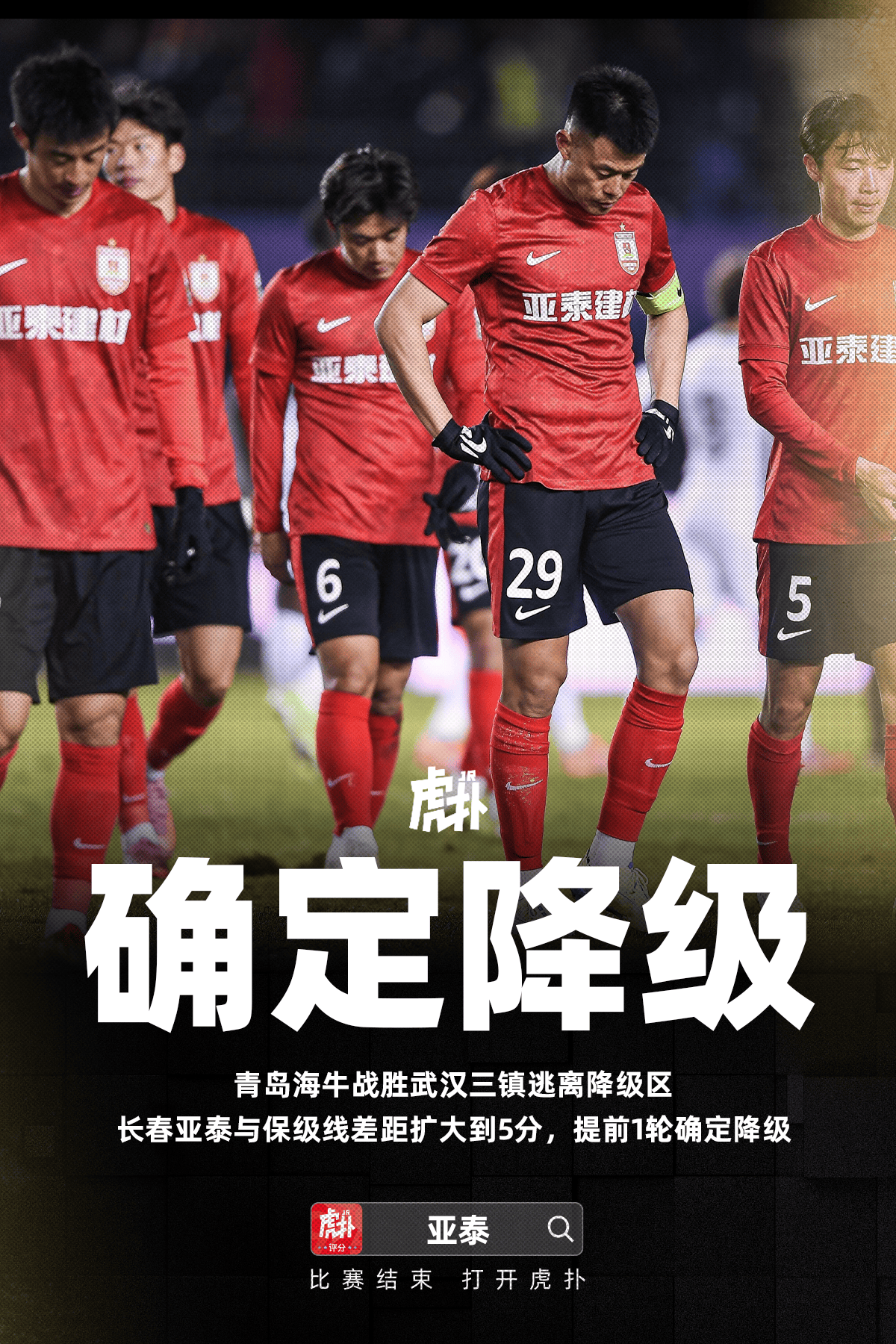虎扑11月02日讯2025中超联赛第29轮,青岛海牛主场击败武汉三镇,这也意味着垫底的长春亚泰提前一轮从联赛降级。