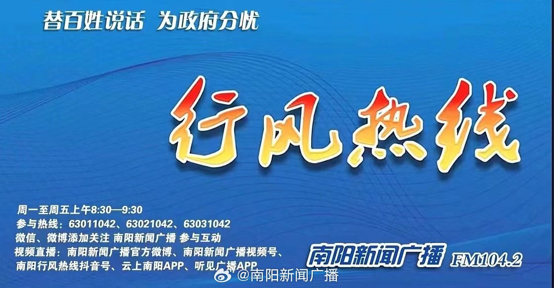网络收看:云上南阳APP、听见广播APP、新浪微博、微信公众平台、微信视频号搜索“南阳新闻广播”,抖音搜索“南阳行风热线”,也可在以上平台直接留言互动;