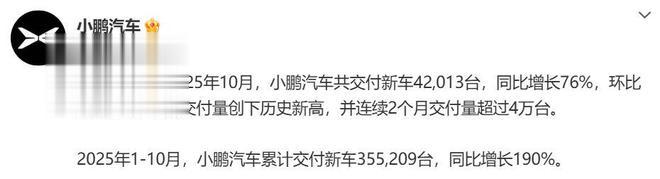 小鹏汽车:2025年10月,小鹏汽车共交付新车42,013台,同比增长76%,环比增长1%,单月交付量创下历史新高,并连续2个月交付量超过4万台。