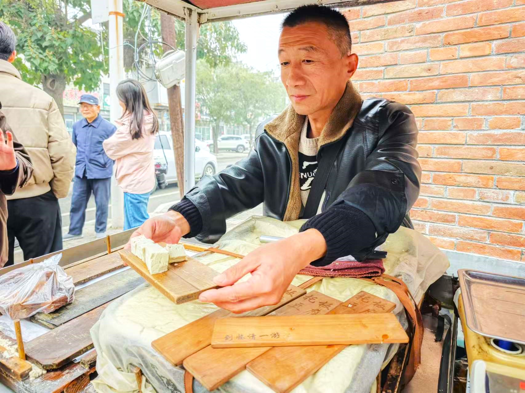 您见过买了豆腐当场放在木板上吃的吗?在聊城市临清市运河钞关北侧的巷子口,魏金辉的托板豆腐摊位前,从早晨七点多到下午五点顾客不断。别看只是一辆小小的三轮车,魏金辉一天能卖三盒豆腐,累计约200斤。