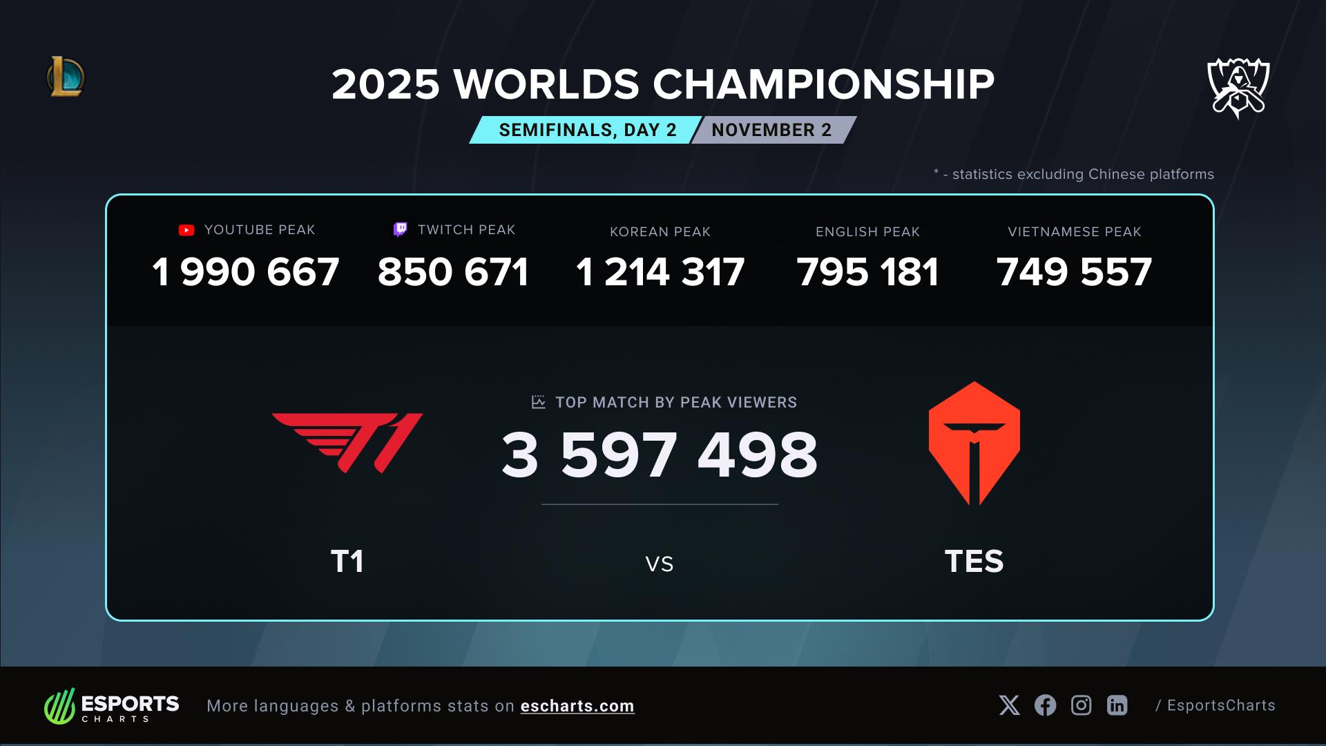 虎扑11月02日讯外媒统计T1对战TES海外峰值来到359万,为本次全球总决赛最高。