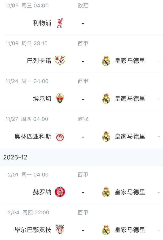 联赛中皇马将先后客战巴列卡诺、埃尔切、赫罗纳、毕尔巴鄂竞技。欧冠赛场将客战利物浦、奥林匹亚科斯。下次回到主场将是下个月7号联赛第15轮对阵塞尔塔。