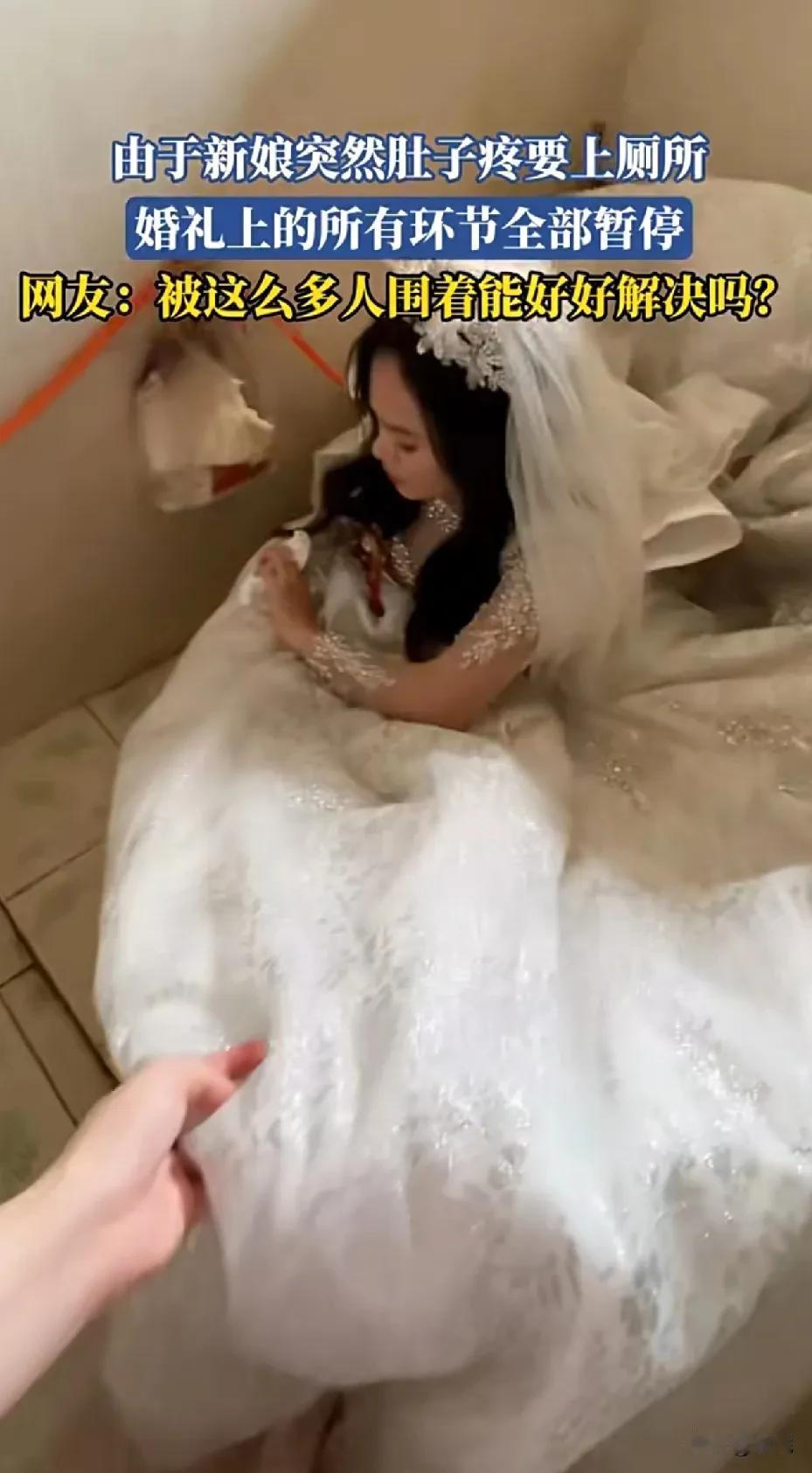 广东一新娘突然肚子疼要上厕所,婚礼上所有环节全部暂停,新娘要拉屎。三个人扶着婚纱陪上厕所,场面很是尴尬! 其实人有三急是难免的,这也是老一辈不让结婚当天早上不让吃东西的原因。也难为新娘,这么多人陪着,能拉的出来吗? 其实好的化妆师在换婚纱之前,都会询问下新娘是不是要解决三急问题,明显这就是化妆师资质的问题。即使穿上了脱一下,也只要几分钟的事情,为何会让新娘穿着婚纱去上厕所? 上厕所人之常情,啥都拍,然后发到网上,就尴尬。当然,只要自己不尴尬,尴尬就是别人。注定这个婚礼,是有味道的婚礼,一辈子难忘,陪着去上厕所的人也难忘! 我就是比较好奇,完事怎么擦?不会不擦了吧?还是找老公擦?