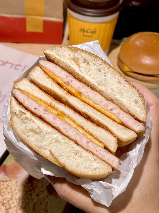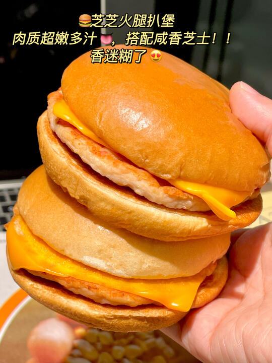 里面超嫩的火腿扒搭配咸香浓郁的芝士,还有蓬松柔软的汉堡皮..,谁吃谁迷糊!