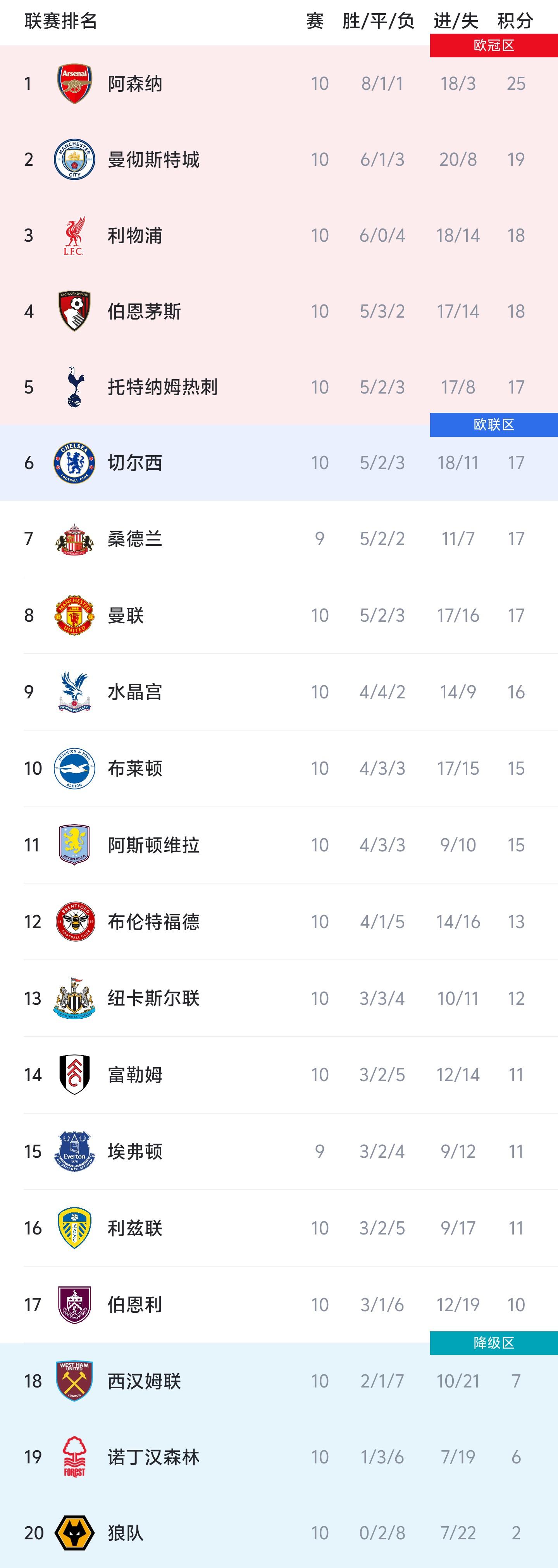 降级区方面,西汉姆联在本轮赢球后反超诺丁汉森林,上升到了积分榜倒数第三位,狼队则继续0胜垫底。