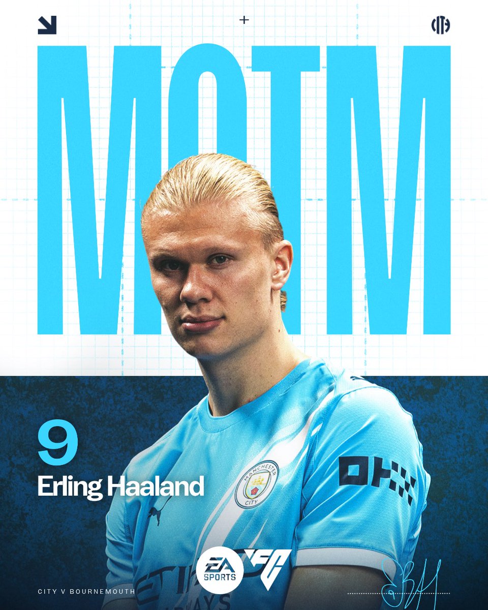 曼城官方:哈兰德当选曼城3-1伯恩茅斯队内最佳球员
