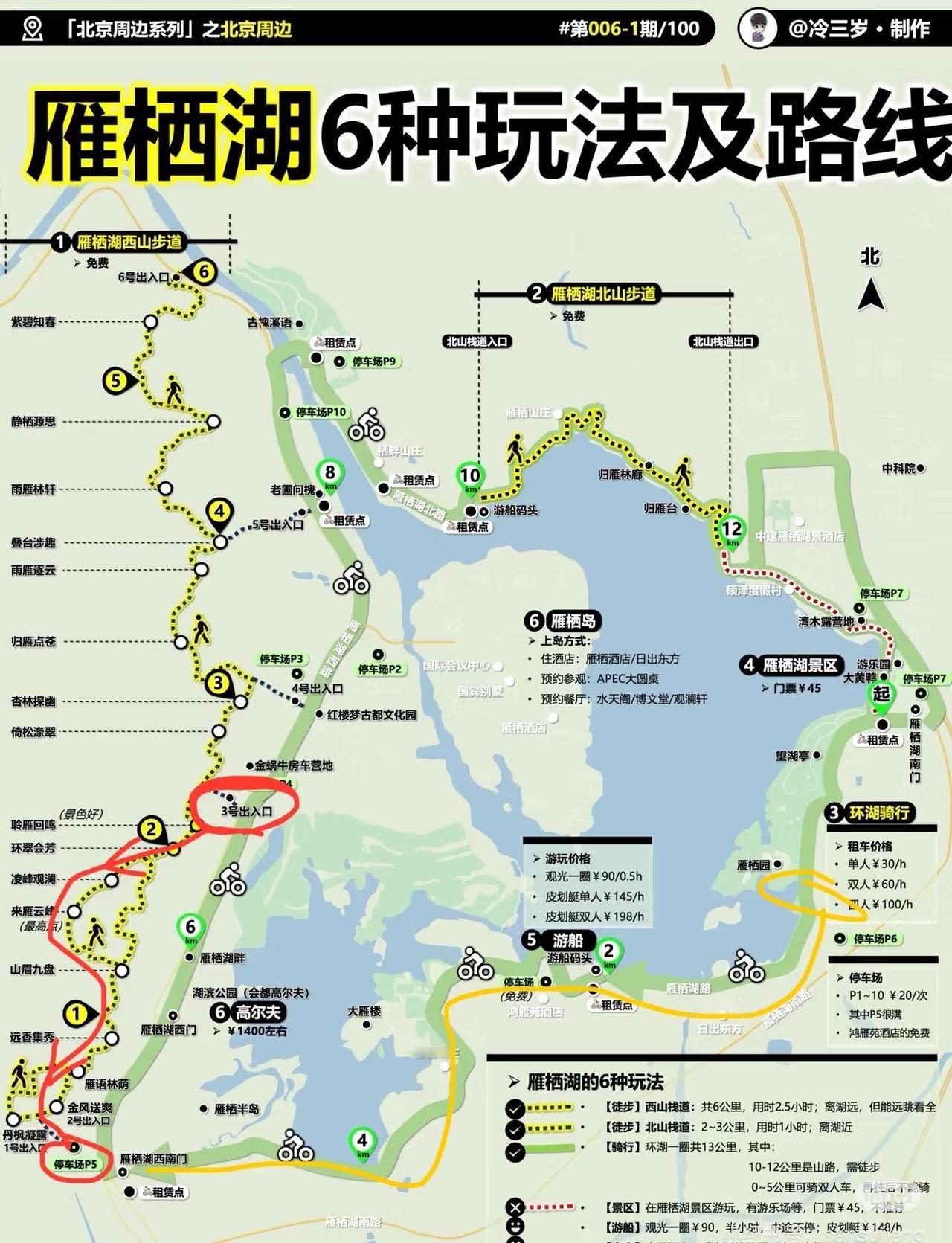 直到站在这里 才明白为什么叫京郊小瑞士 p1在另一个帖子的评论区被赞爆了,于是单开一篇攻略贴! 📍北京怀柔·雁栖湖·西山步道·聆雁回鸣(近三号口) 实测这个观景台是最好看的,其他的台子都有植被遮挡 一个下午 步行➕骑行的行程(路线图p4) 🚄清河站-雁栖湖站-红螺寺-雁栖湖3号口-雁栖湖站 上午十点到雁栖湖站,红螺寺游玩2h(详见前一个贴 12点出发红螺寺-雁栖湖西山步道3号口(打车15r左右,秒接,因为这个点很多人来红螺寺) 3号口下车后,需要上15min的台阶,直接到聆雁回鸣,然后沿着p4红线一路走到2号口 非常推荐这条线,中午大部队来了,基本都是从2号口走到3号,要上超多台阶不说、还人挤人,看很多小孩老人受不了了,至少我从3到2反着走人不多也轻松😌 回到2号口后,🅿️5停车场就在附近,直接租车(30/h单人车)骑行p4的黄线,本来导航的是🅿️7停车场,但骑到黄圈那块就已经半小时了(一路拍照),所以干脆原路返回(实测返回更累)。看很多从🅿️7(也就是南门)来的朋友都骑了共享单车,也是个省钱的办法 回到停车场后还有点早,走了与西山步道平行的一条平路线(不爬山)也很美,适合最后累了逛逛 雁栖湖 北京郊区游 北京秋景 整点儿摄影节奏