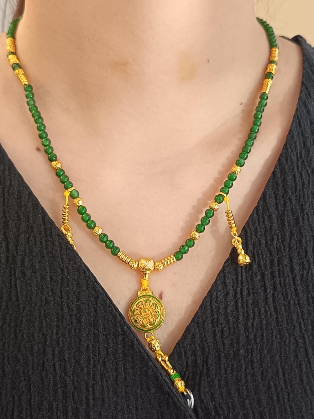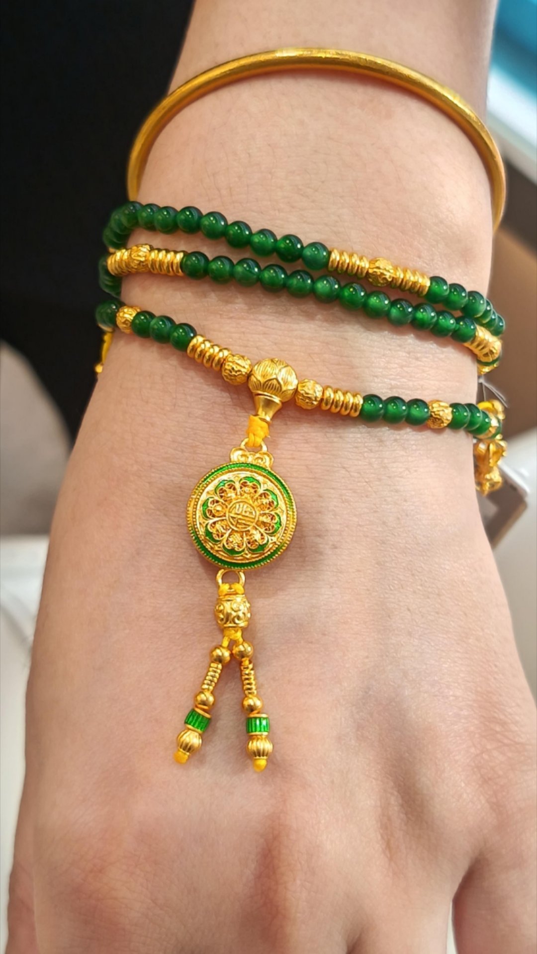 项链上,宝相花吊坠工艺细腻,周围金饰雕琢精美,搭配翡翠珠链,戴在颈间贵气满满;手链叠戴设计,金镯与翡翠金珠链层次丰富,摇曳间尽显精致。