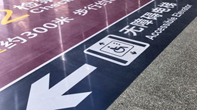 10月29日,记者也从松江站北区大楼的3楼核验身份进站。而记者要乘坐的17时59分的G7792次列车,将停靠南区1站台。因而,记者也需要转移到南区。设想自己是一名残疾人,那么首先要找的,就是无障碍电梯——候车大厅的中央地面上,贴着巨大显眼的指示标志。标志上部,提醒前往南区1号、2号检票口距离是300米,步行约8分钟,下半部分则是一个箭头,指向无障碍电梯位于东侧。