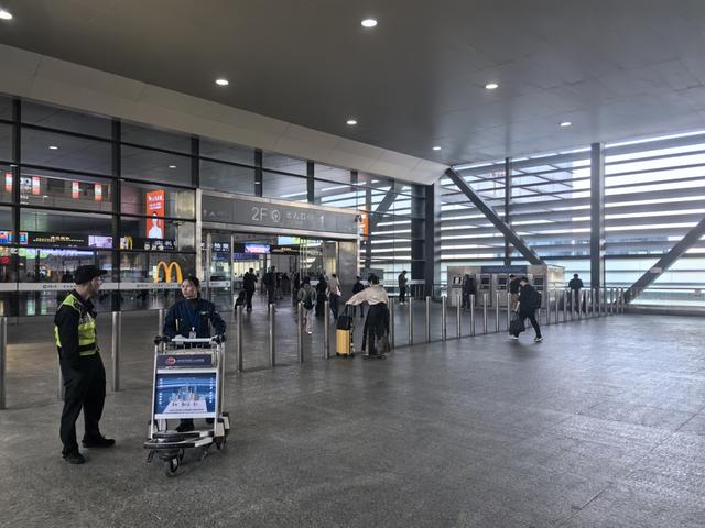 虹桥枢纽在机场与高铁站连接通道的尽头处安装了一排不锈钢路障,一侧留有了可供轮椅通行的一扇门作为“爱心通道”。