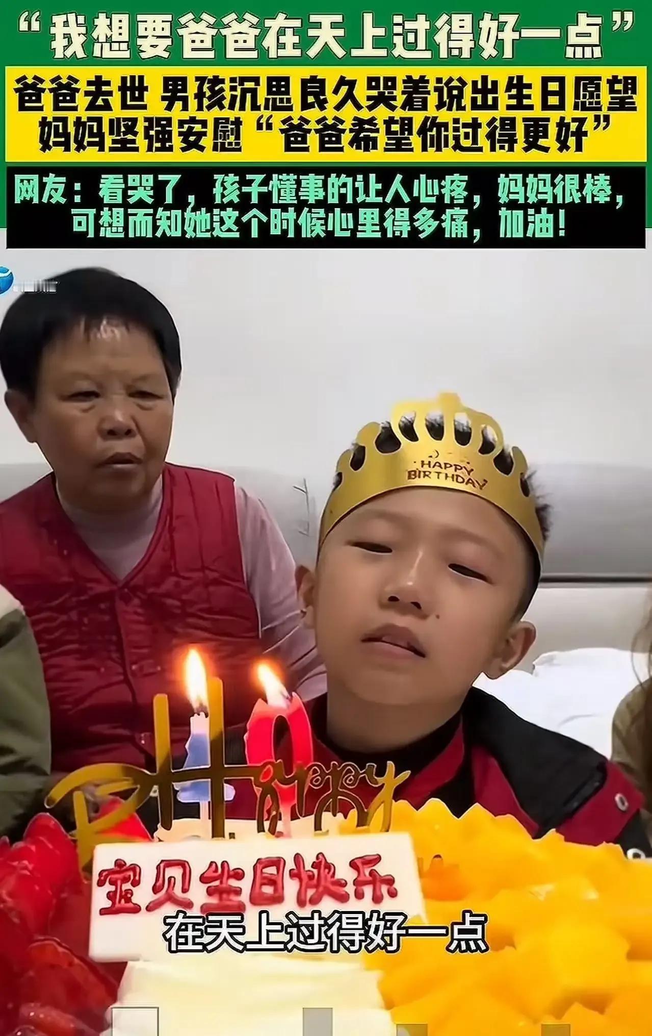 看哭了!湖南,妈妈给儿子过生日,儿子许的愿望,让人听了眼泪直流!儿子:“我想要爸爸在天上过得好一点……”网友:孩子的一句话,把我一个快50岁的男人说哭了!妈妈也很棒,可想而知她这个时候心里得多痛…… 看完这段话,或许你会忍不住掉下眼泪。一个简单的生日愿望,却让无数人心碎不已。或许有人会说,这只是一个普通孩子的天真许愿,但当你细细品味,却会发现这背后隐藏的,是太多太多的父母与子女之间无法用言语表达的爱与牵挂。 这位小男孩的愿望,或许只是一句简单的“让爸爸在天上过得好一点”,但它却深刻反映出一个家庭的无奈与坚强。父亲的离去,给这个家庭带来的不仅仅是空缺,更是一份永远无法填补的痛。而这个孩子,或许还太小,无法理解死亡的真正意义,但他用最纯粹的心,表达了对爸爸的思念。 而作为母亲,她的坚强令人动容。在这个特殊的日子里,她或许要扮演两个角色:一个是孩子的母亲,陪伴他渡过每一个重要的时刻;另一个,是这个家庭的支柱,忍受着心中的伤痛,把爱深藏在心底。她的泪水也许比任何人都要多,但她选择了坚强,选择用爱守护这个家庭的希望。 我们常说,孩子的眼睛是最纯真的镜子。这个愿望看似简单,却折射出父母的无尽牵挂和深沉的爱。它让我们意识到,家庭的爱,从来不是一句空话,而是在每一个细微的瞬间,用行动和心意用力守护。 或许我们每个人都曾在某个瞬间,许过类似的愿望:希望亲人平安,希望他们过得好。可惜,人生没有重来,没有彩排。我们能做的,只有用心去珍惜身边的每一个人,把爱传递出去。 这份愿望,提醒我们:家庭的意义远比我们想象中的更为重要。无论生活多忙碌,无论未来多不确定,都不要忘了,用一份真心去关爱家人。因为,也许在某个你不经意的瞬间,你的“在天上过得好一点”的愿望,也会悄然成为别人的心声。 读到这里,你是否也被触动了?也许我们都应该学会更用心去聆听家人的心声,学会用行动去传递那份最真实的爱。毕竟,人生短暂,家庭的温暖,才是我们一生中最宝贵的财富。让我们一起,用爱守护那些我们深爱的人,也让每一个愿望都变成生活中的温暖力量。生日 感恩 教育