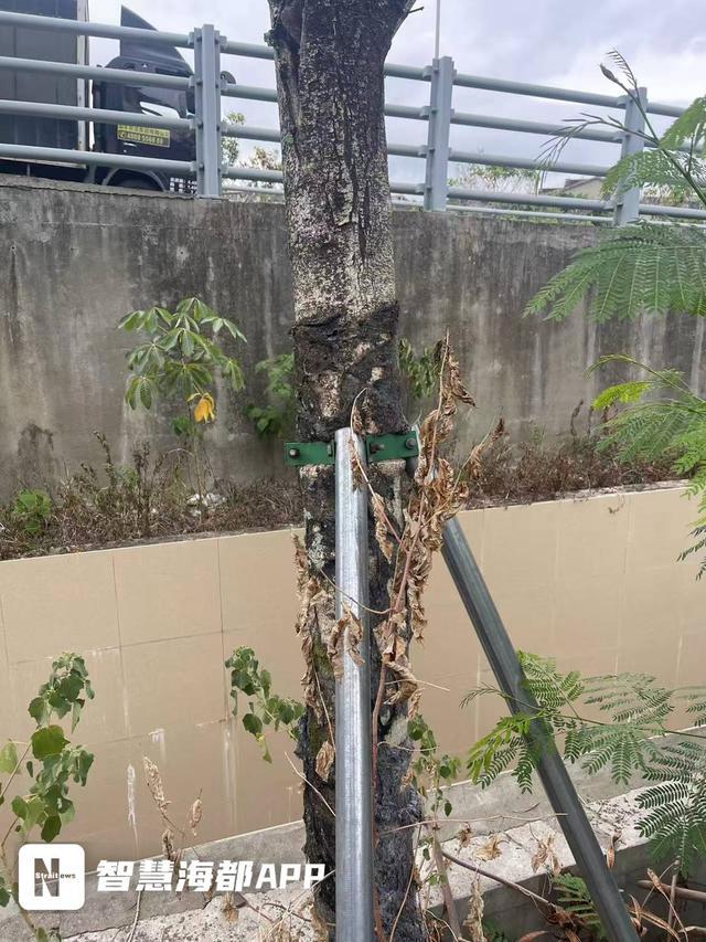 记者现场走访发现,此处8棵羊蹄甲均设有护木架,在护木架与树干接触的位置,铁质架体已嵌进树干,嵌入深度约2厘米,部分树干外观因挤压出现凹陷。