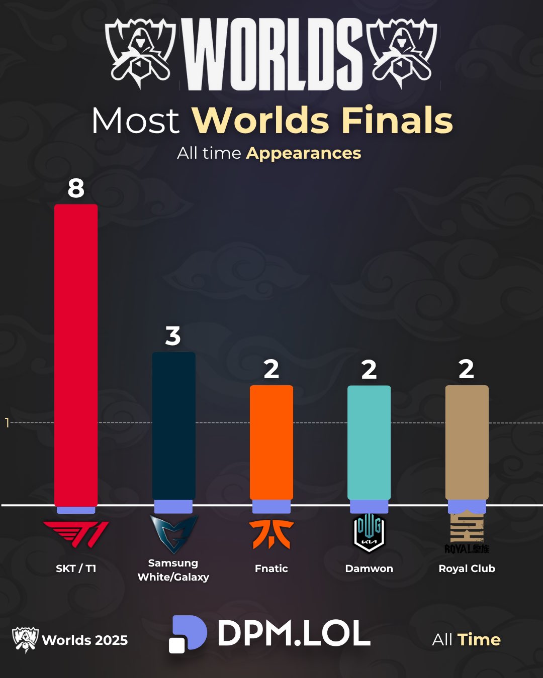虎扑11月03日讯昨日T1击败TES进入S15决赛,赛后外媒统计各战队进入S赛决赛阶段次数,具体如下: