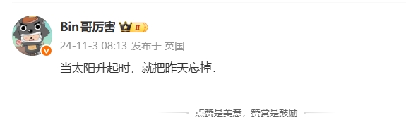 Bin在决赛第二天(去年今天)更新微博:“当太阳升起时,就把昨天忘掉。”