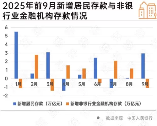 逐月来看,2025年以来已出现多个月新增居民存款和非银行业金融机构存款发生周期变化情况,如7月、8月居民存款连续两个月低于季节性增幅,同时非银金融机构存款相应增加。