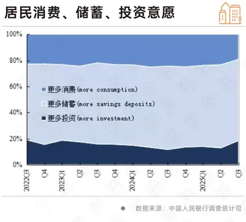 《城镇储户问卷调查报告》显示,2025年第三季度,倾向于“更多消费”的居民占19.2%,比上季低4.1个百分点;倾向于“更多储蓄”的居民占62.3%,比上季低1.5个百分点;而倾向于“更多投资”的居民占18.5%,比上季高5.6个百分点,且明显高于近两年水平。