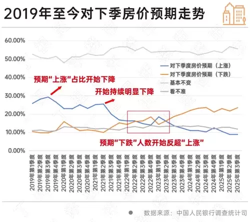 我们梳理了2019年第一季度至2025年第三季度的调查数据,结果显示,当前居民对房价预期已跌至2019年至今的最低点。