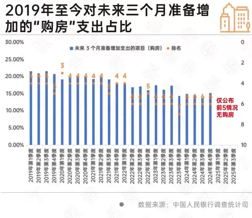 2025年至今,《城镇储户问卷调查报告》仅公布未来三个月准备增加的支出项目的前5位,“购房”连续3个季度不在其公布范围内。