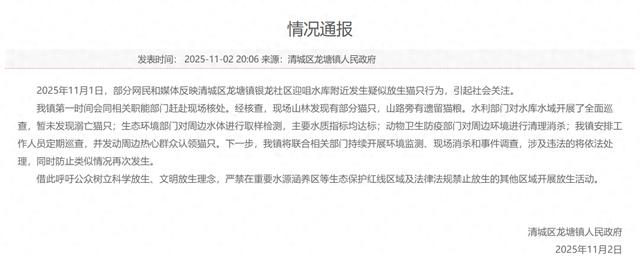 2025年11月1日,部分网民和媒体反映清城区龙塘镇银龙社区迎咀水库附近发生疑似放生猫只行为,引起社会关注。