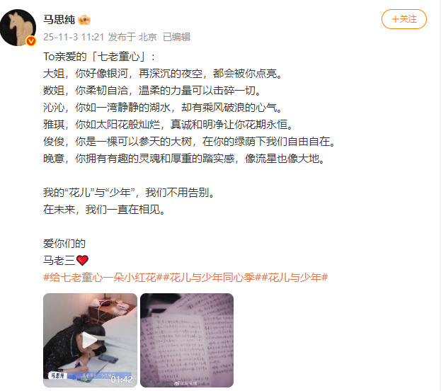 马思纯眼中七老童心,马思纯我的花儿与少年一直在相见,咱就说感受到了真心换真心的一趟治愈之旅,期待住和你们的再相见啦~