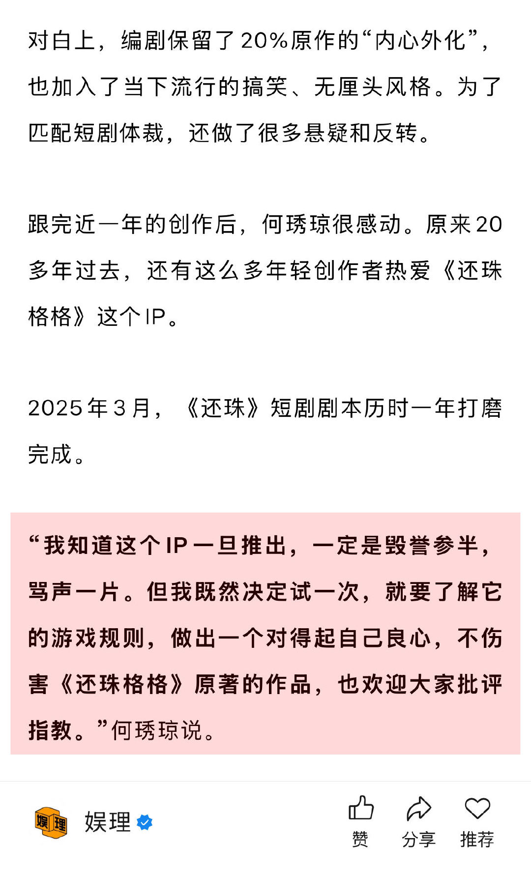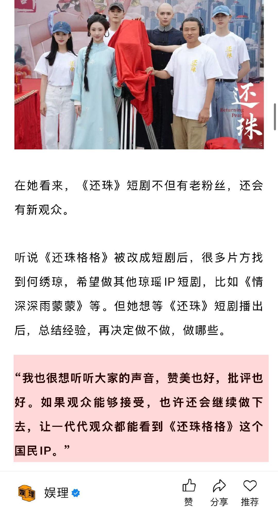 导演谈短剧还珠选角罗一舟胡连馨 短剧还珠有罗一舟的荧屏初吻 从2024年3月得知《还珠格格》将被翻拍成短剧,到2025年3月短剧剧本打磨完成,跟完近一年的创作后,该系列制片人何琇琼很感动。“我知道这个IP一旦推出,一定是毁誉参半,骂声一片。但我既然决定试一次,就要了解它的游戏规则,做出一个对得起自己良心,不伤害《还珠格格》原著的作品,也欢迎大家批评指教。”娱理独家↓