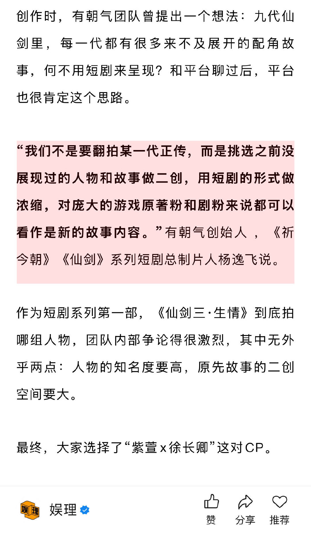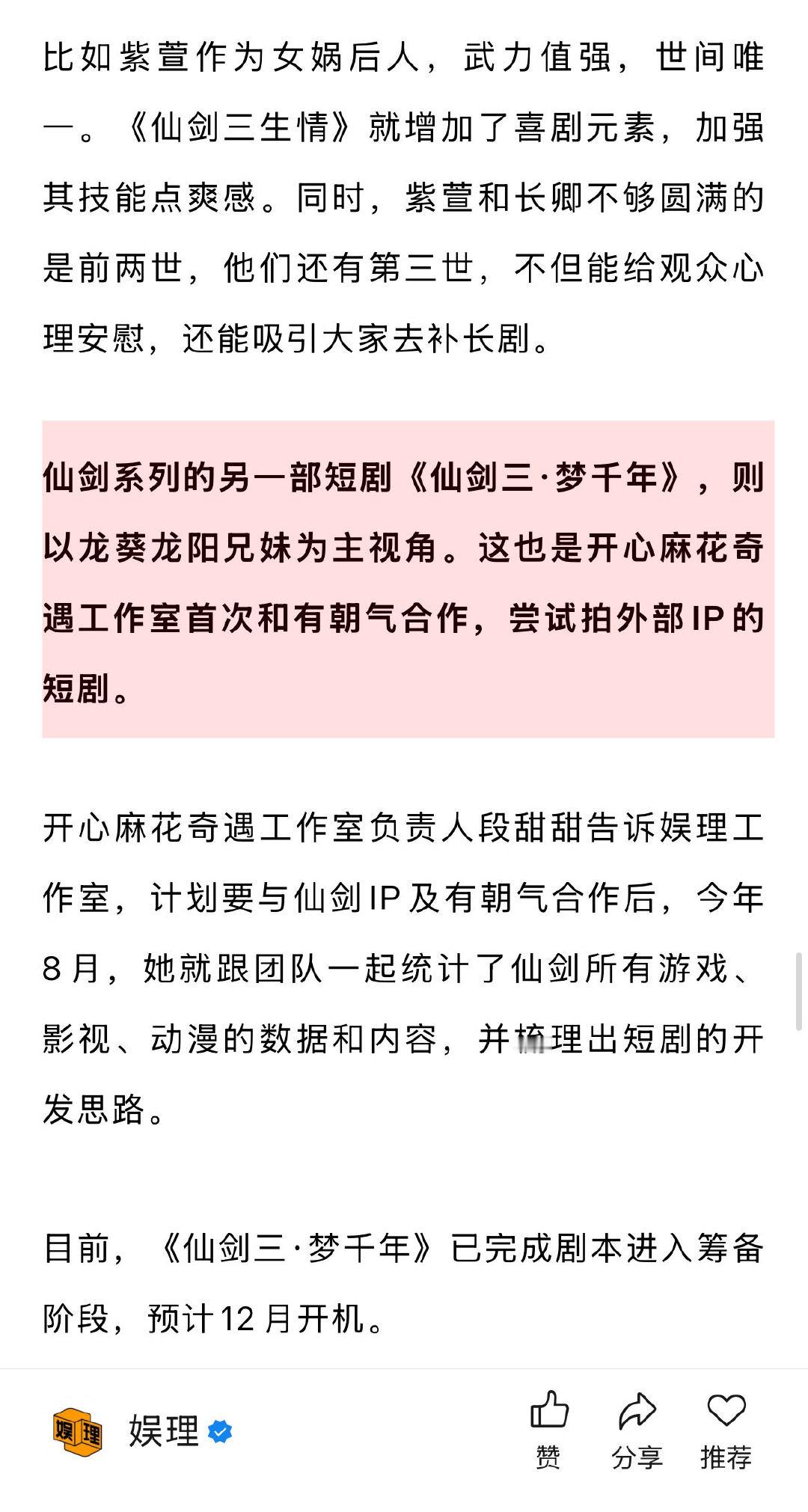 短剧仙剑将拍龙葵龙阳番外 制片人谈仙剑短剧主角是紫萱徐长卿 短剧《仙剑三·梦千年》以龙葵龙阳兄妹为主视角,目前已完成剧本进入筹备阶段,预计12月开机。制作方开心麻花奇遇工作室和负责人段甜甜表示,“大家认知的麻花风,可能是直给的搞笑,幽默的表达。但短剧会以古偶风为主,不会那么虐,同时增加一点不破坏氛围的喜感。”娱理独家↓