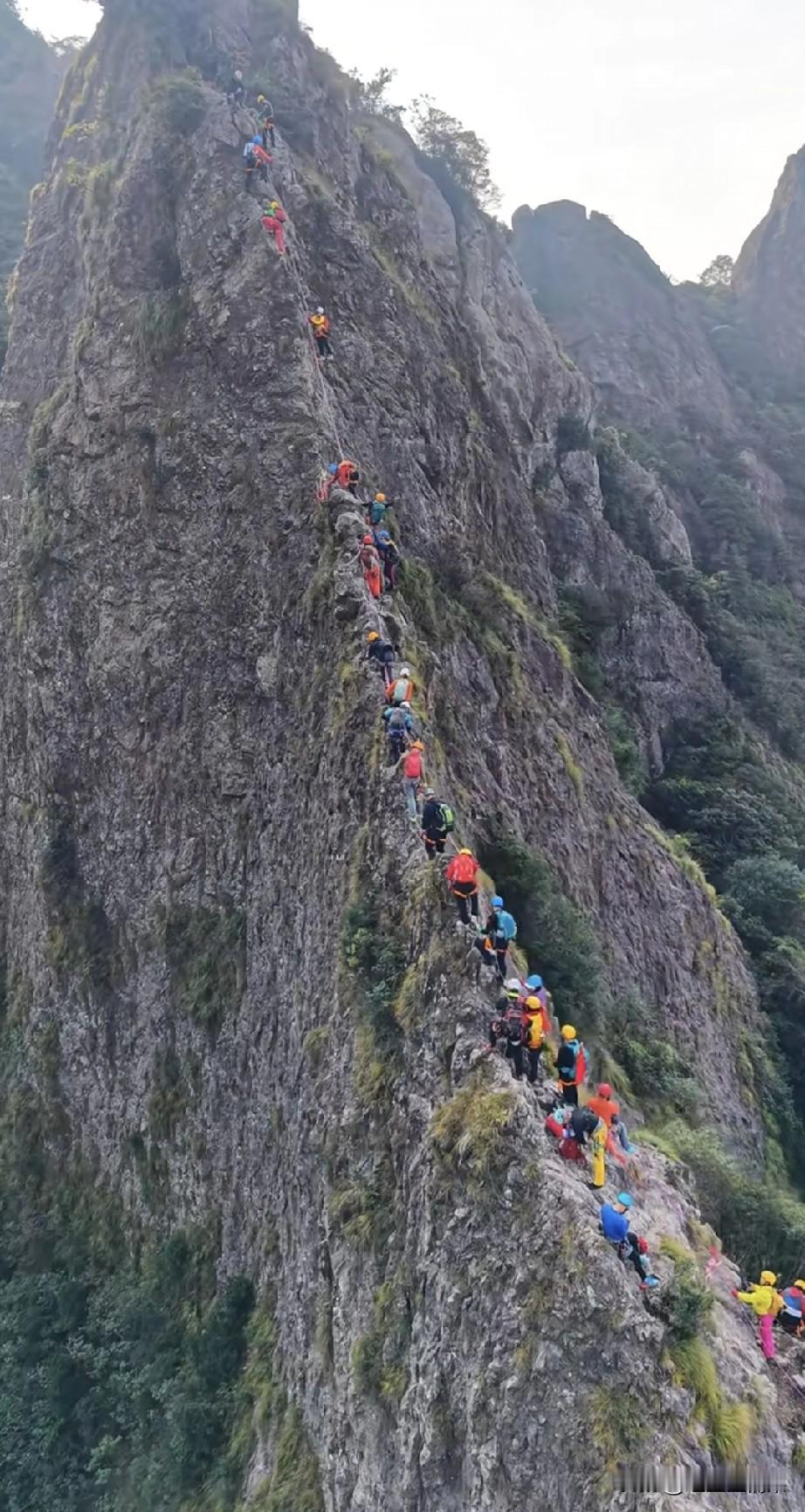 爬这种山的人,心里到底怎么想的,爬上去了又怎么样?爬这种刀锋山,坠落风险不用多说了吧。 冒着生命危险,爬这个,又有什么意义呢?到时候出事了,像这种垂直陡峭的山崖,救援都是要命的,只会祸害救援人员,和他(她)们得家属。 仔细看了一下,这个勇猛的队伍里,还有不少女性。组织这次活动的领队真的是心大啊!这要有一点失误,一波人吃席。