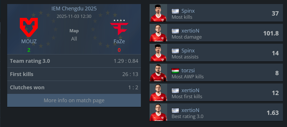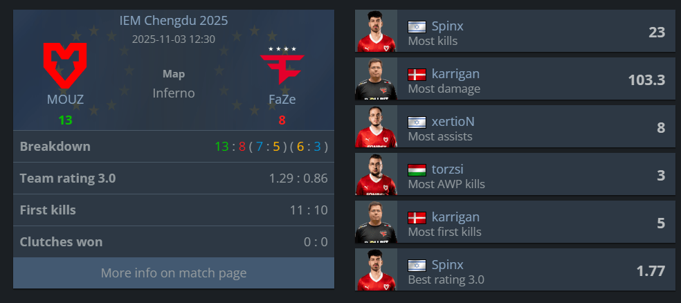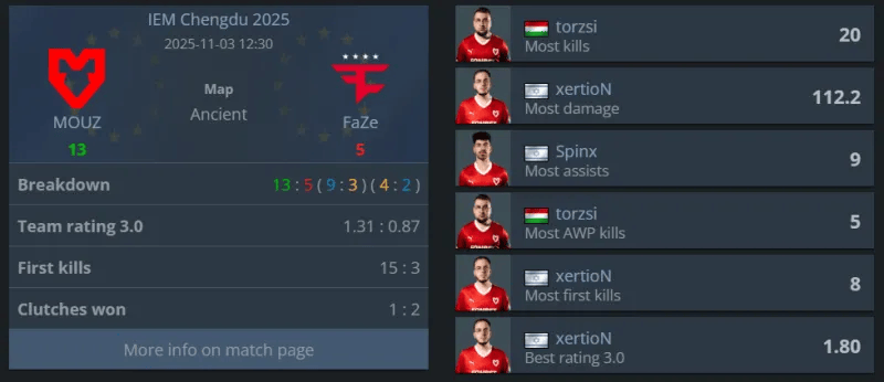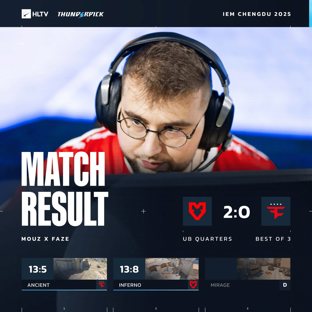 虎扑11月03日讯IEM成都小组赛,FaZe对阵MOUZ结束,FaZe0-2MOUZ:战舰又要返航?卫冕冠军状态不佳落入败者组