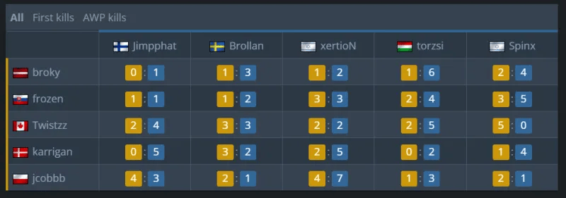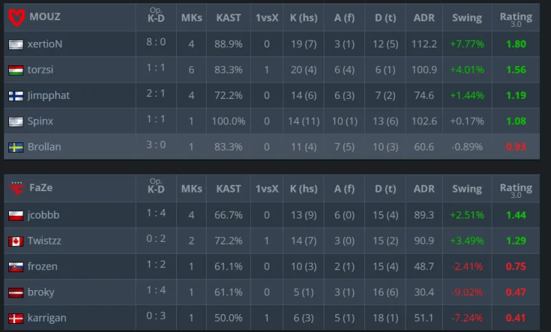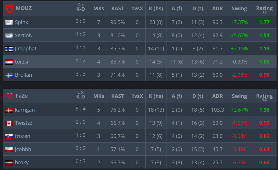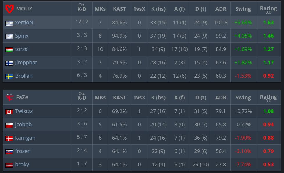 开局为T方的FaZe选择五侧道集结,进行二楼攻势,但吉米二楼usp双杀化解FaZe攻势,随后brollan三杀帮助MOUZ拿下手枪局。第二局FaZe进入经济局。经济局后FaZe选择进攻香蕉道,在寒王和总监的发挥下FaZe连续取分打崩MOUZ经济,FaZe连拿三分反超后MOUZ叫出暂停。暂停回来MOUZ再次调整至最佳状态,数次化解FaZe进攻,xertioN更是超神发挥拿下五杀。上半场比分定格为5-7,MOUZ暂时领先。
