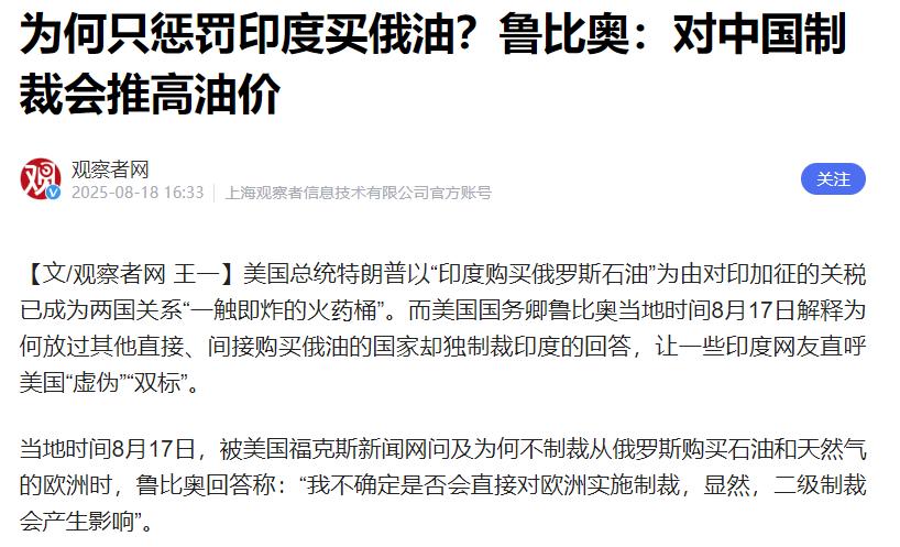 美国为什么不制裁中国买俄罗斯石油?国务卿卢比奥辩解说:“如果你制裁中国购买俄罗斯