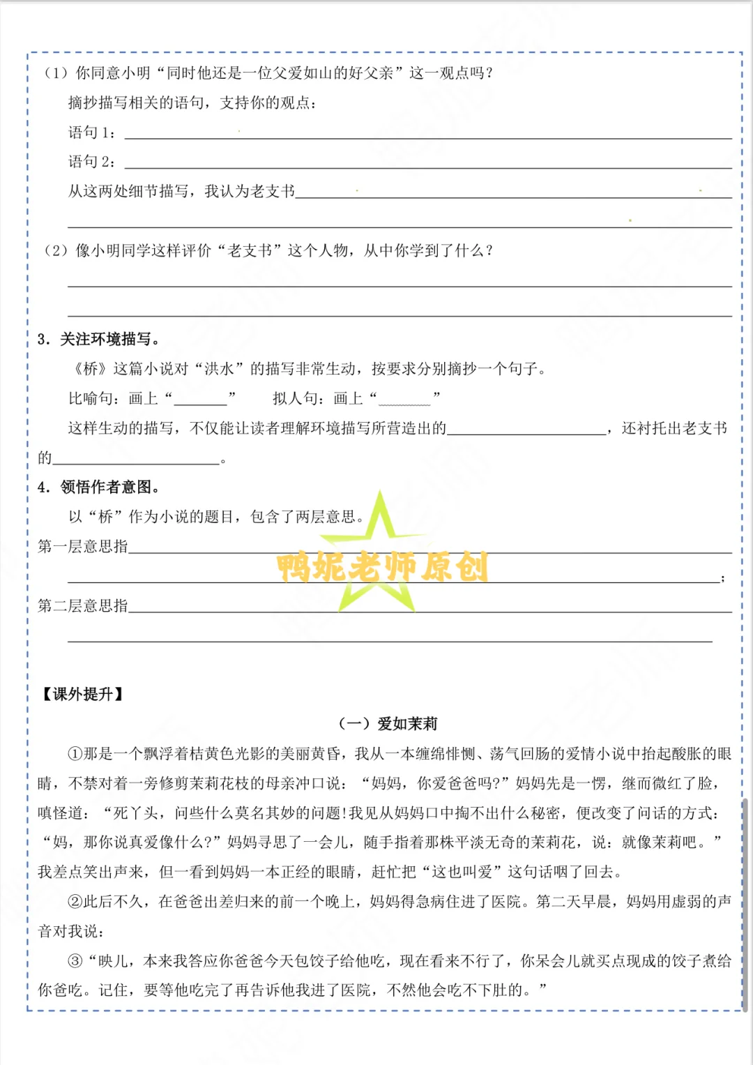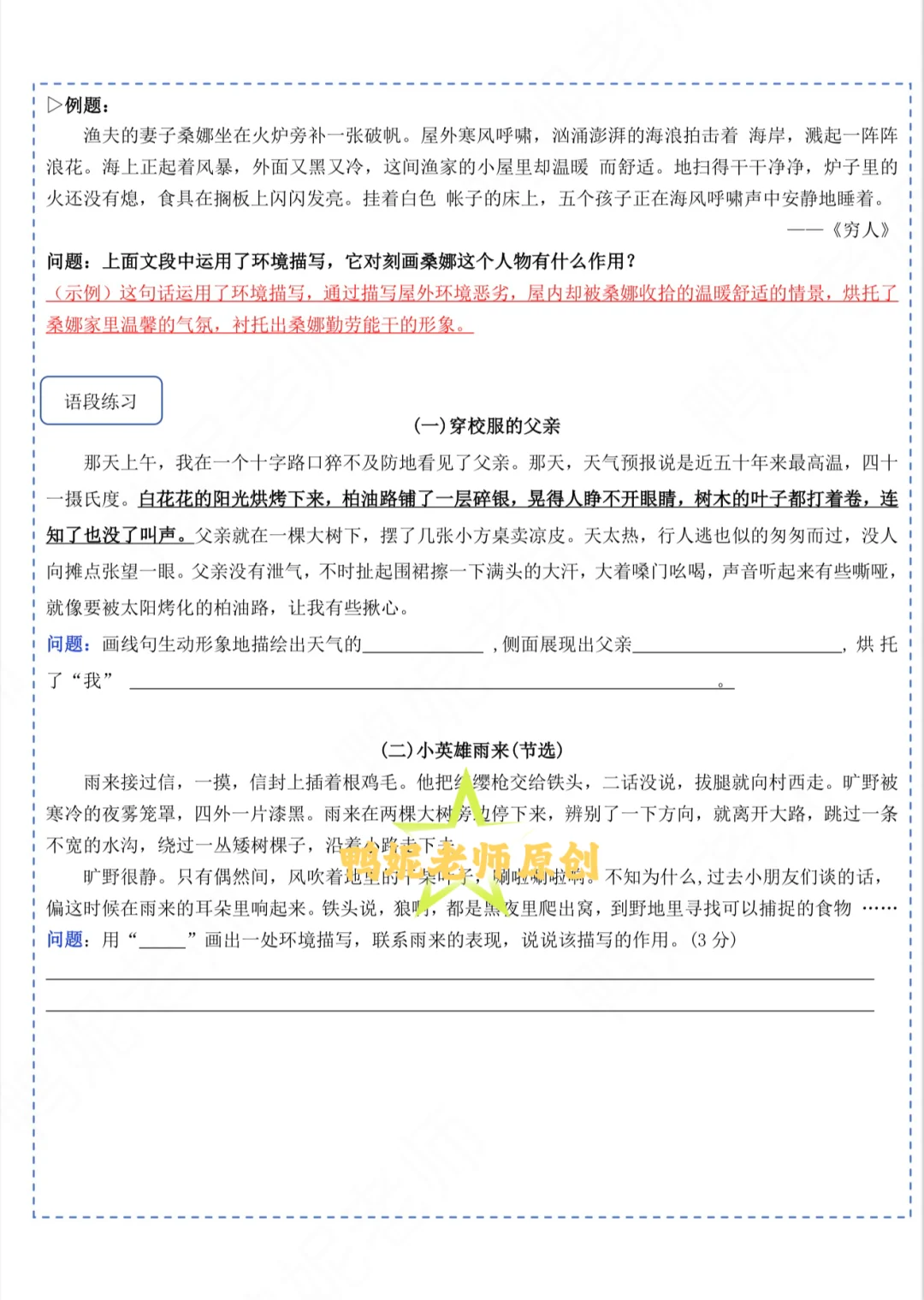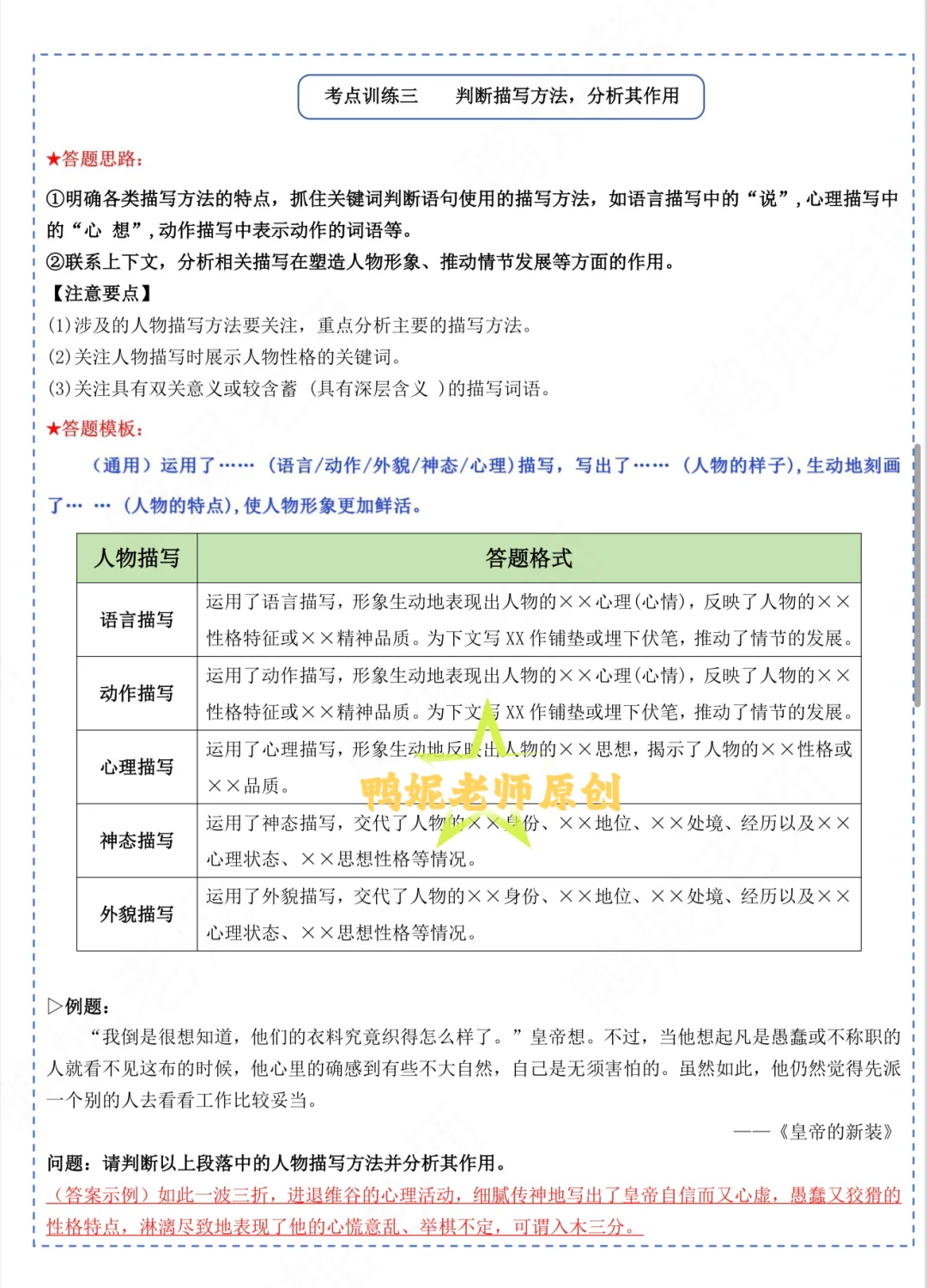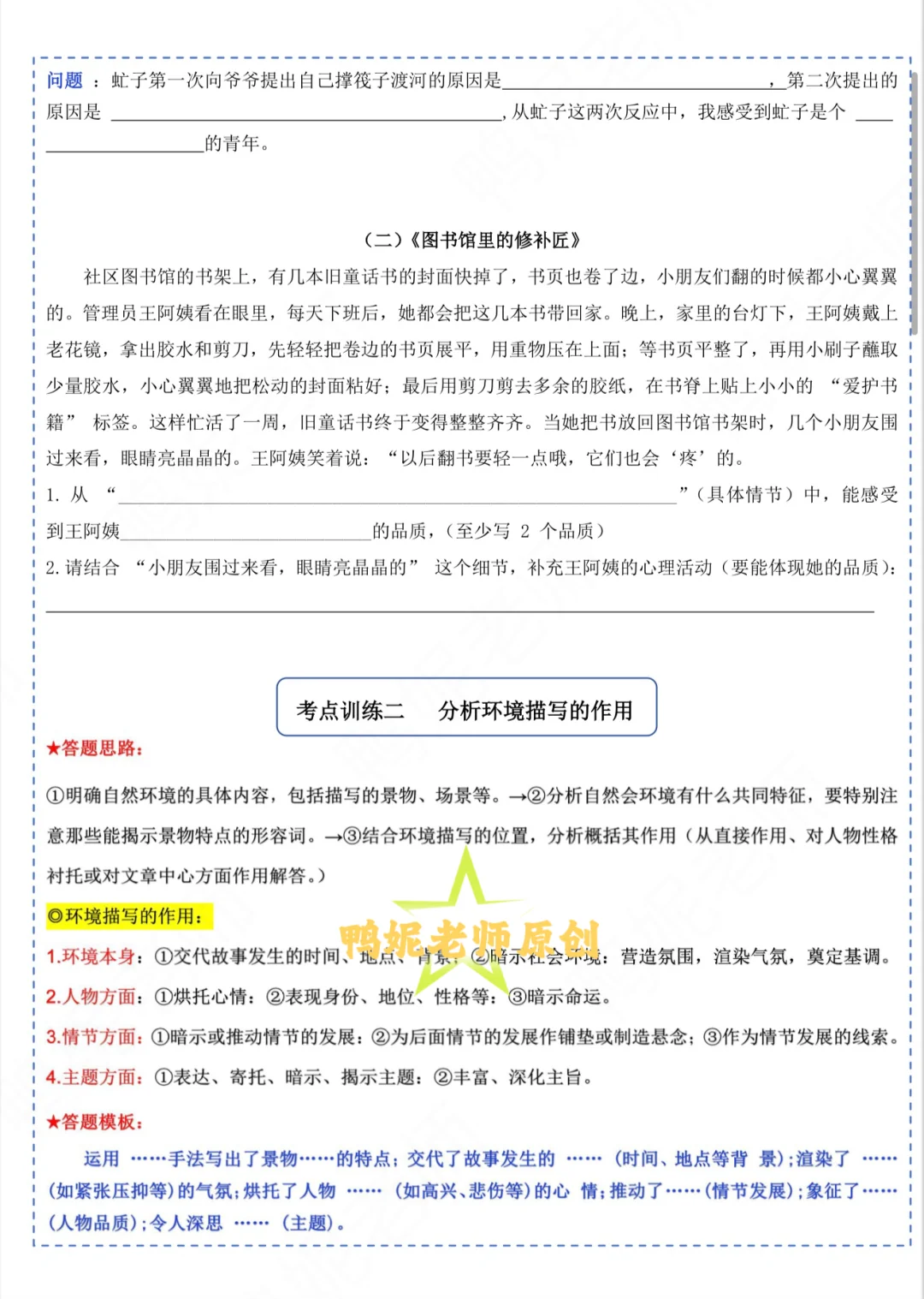 这个周末加班加点把六上语文很重要的一个阅读单元【小说专题】赶出来啦‼️ 这个单元是的主题是“小说”,其中的阅读考点相对集中也有一定难度。一共四个高频考点👇 🔸考点一:分析人物形象 🔸考点二:分析环境描写的作用 🔸考点三:判断描写方法,分析其作用 可以这样给孩子们训练: [一R]先总结考点,再结合例题给孩子们讲解答题思路, [二R]提供答题模板,讲清楚得分点; [三R]进行经典语段的练习,巩固知识点; [四R]课内阅读温故知新,精选真题提升能力。 👉答题思路➕答题模板➕例题讲解➕六篇语段练习➕三篇课内外提升阅读 (‼️答题模板的部分可以利用早自习让他们熟读巩固)