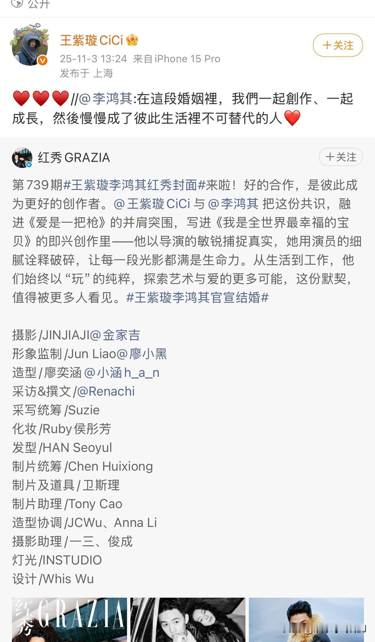 王紫璇李鸿其官宣结婚第一次见杂志官宣结婚的,看起来郎才女貌不错不错