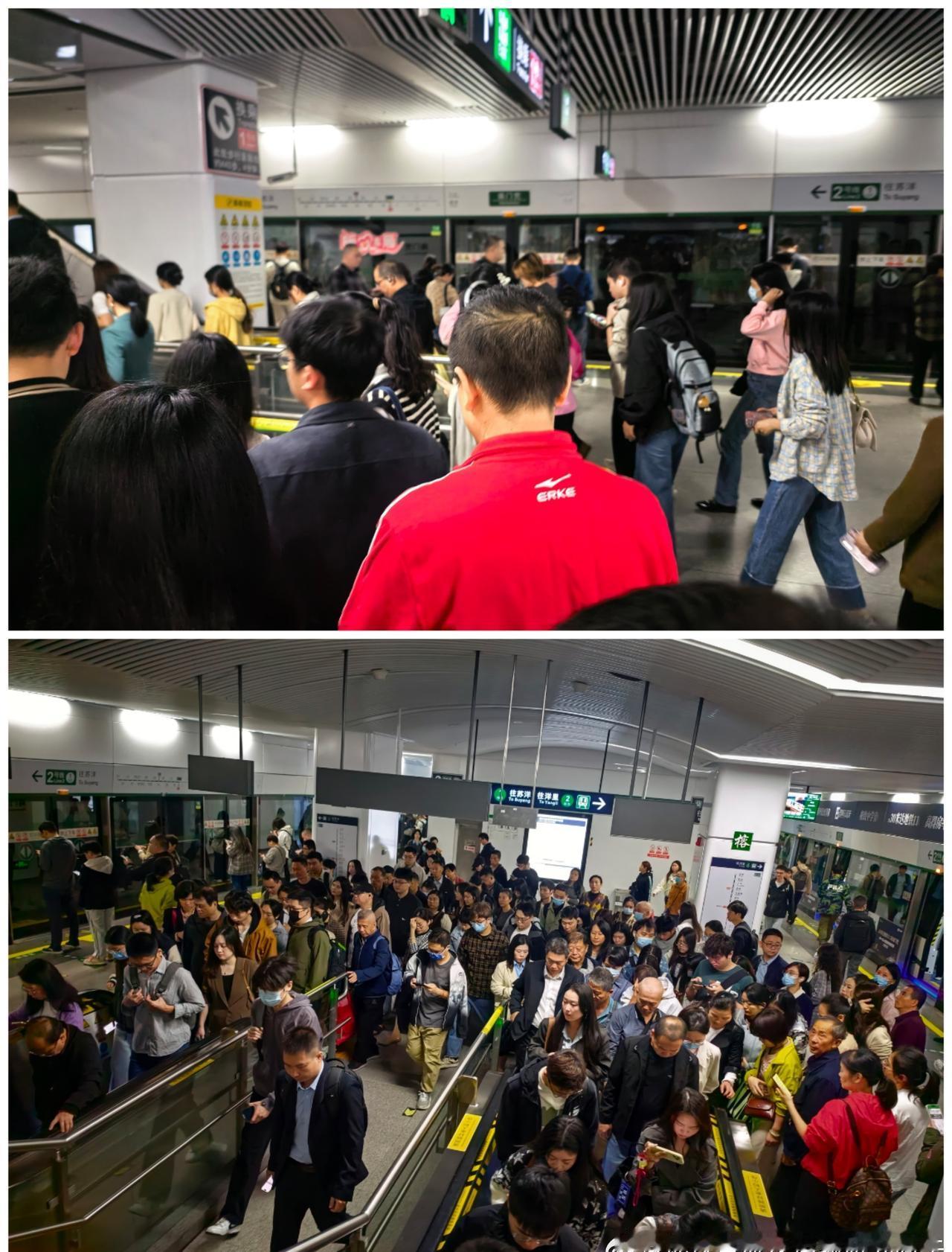 08:20,宁化→西洋区间(鼓山方向,图1)。 08:22,西洋→南门兜(图2)。 08:23-25,南门兜站出站和换乘1号线客流以及1/2换乘通道(图3-4)。