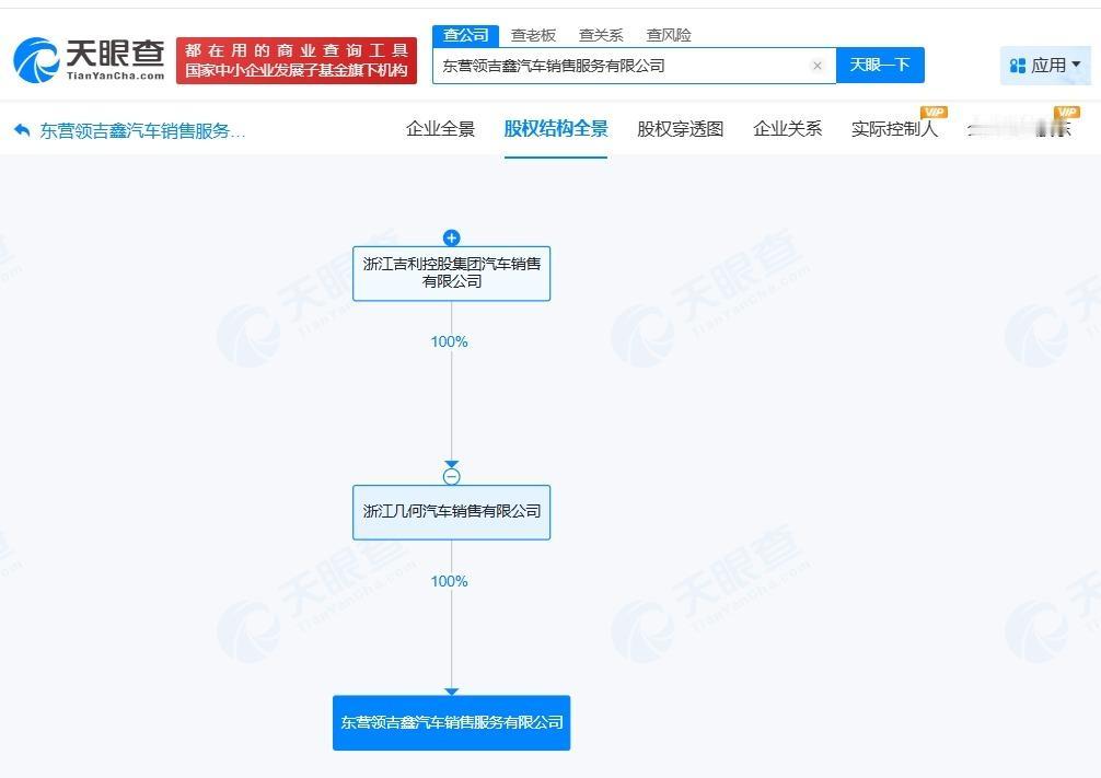 吉利在东营成立汽车销售服务新公司注册资本1000万 天眼查工商信息显示,近日,东营领吉鑫汽车销售服务有限公司成立,法定代表人为朱其谦,注册资本1000万人民币,经营范围包括新能源汽车整车销售、汽车零配件零售、汽车零配件批发等。股权全景穿透图显示,该公司由浙江几何汽车销售有限公司全资持股,后者为浙江吉利控股集团汽车销售有限公司全资子公司。 天眼查信息: