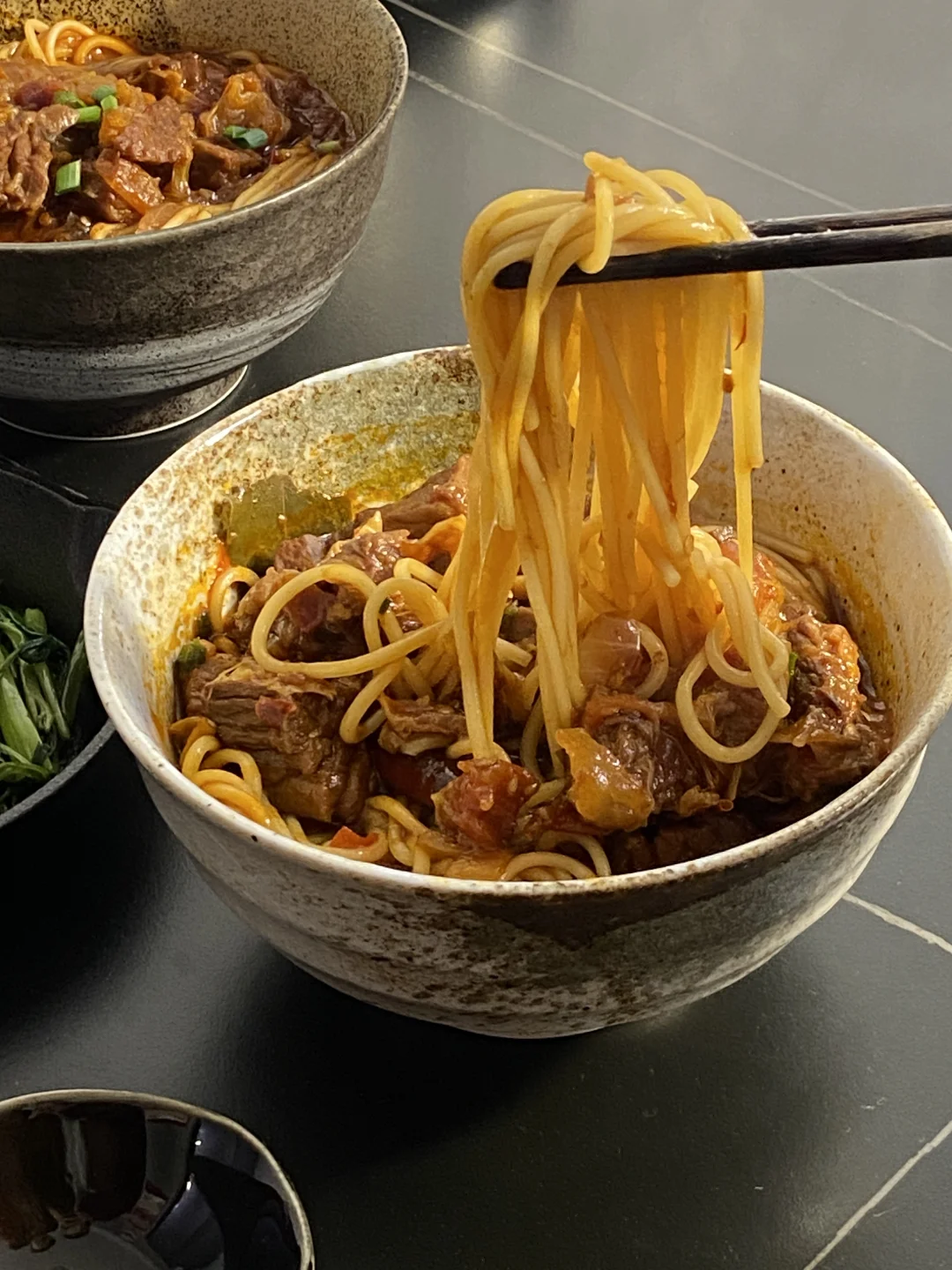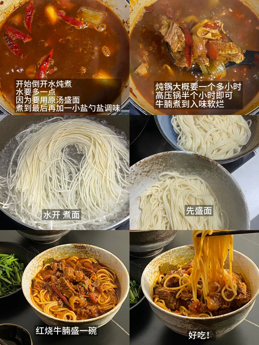 7)炖煮:普通锅要一个多小时,时间紧张建议可以的话直接用高压锅,压个20-30分钟肉就软烂了,面煮好后盛一勺原汤,再盖上红烧牛肉!好恰!