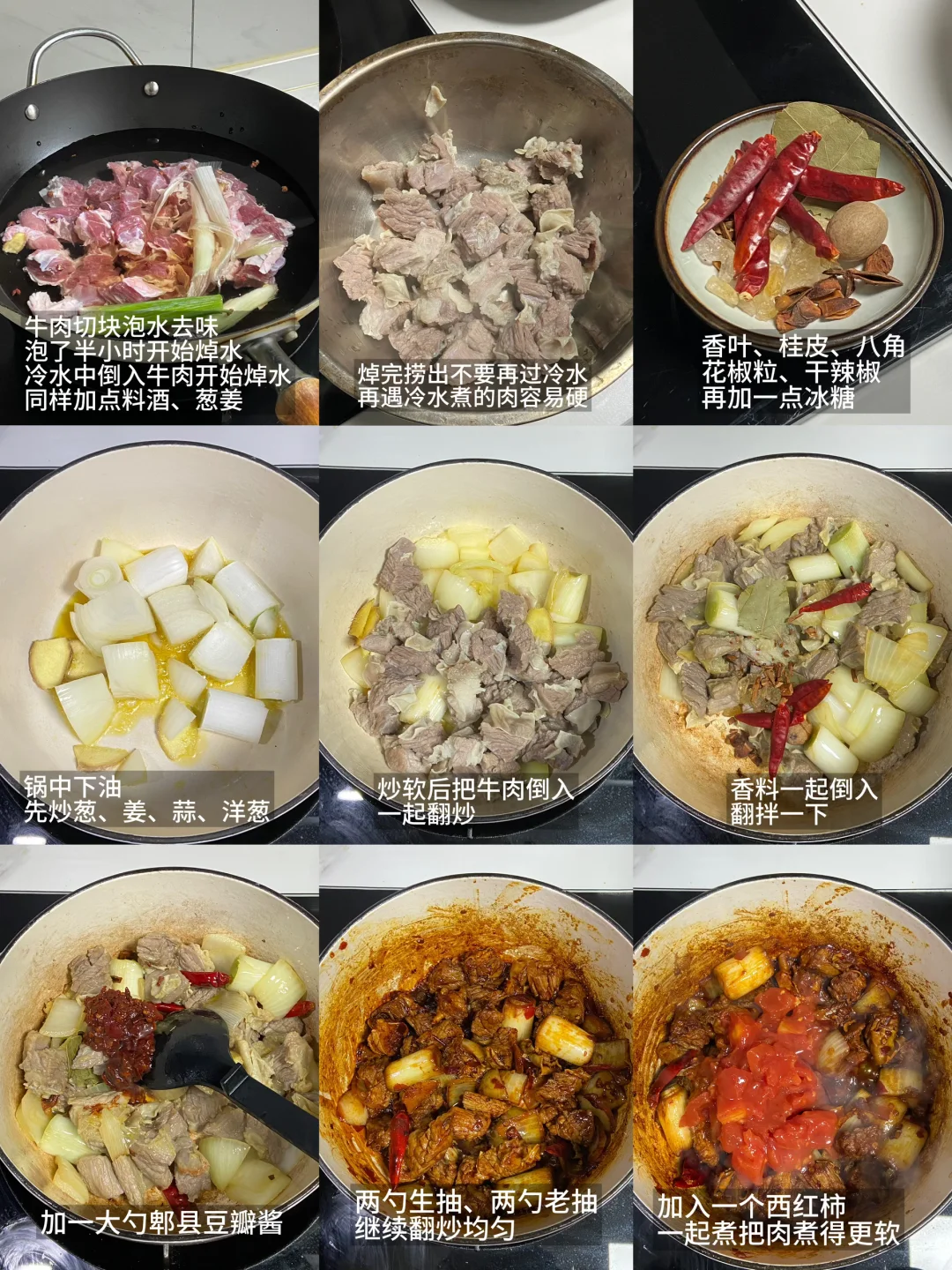 牛腩|葱|姜|蒜|洋葱|西红柿|香叶|桂皮|八角|花椒粒|干辣椒|冰糖|郫县豆瓣酱