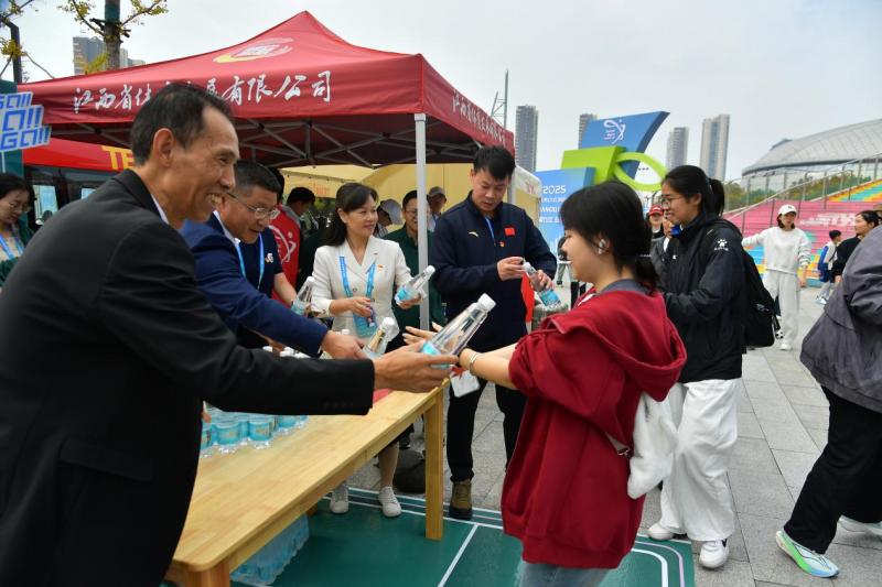 此次活动的一大亮点,是赛事与文创、助农的深度融合。党支部在志愿服务点特设助农文创推广区,党员志愿者化身“推介官”,向观众展示庐山竹编、九江茶饼、鄱阳湖特产等系列文创农产。现场设置的二维码扫码购物区,让观众无需远行就能便捷购买地道好物,实现“观国际赛事、购特色农产”的双重体验。
