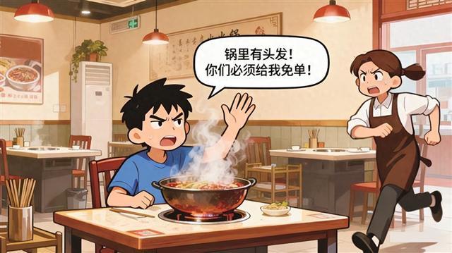 一家知名牛肉火锅店经营多年,凭借着新鲜的食材和优质的服务积累了不错的口碑。今年6月,小勇(化名)在火锅店里用餐,突然招手喊来服务员:“锅里有头发!你们必须给我免单!”