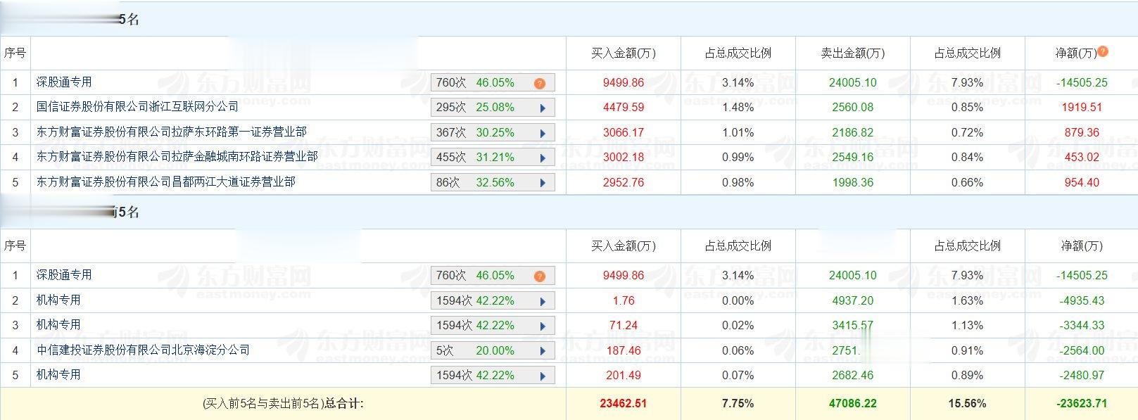 凯美特气(002549.SZ)今日跌停,换手率17.62%,成交额30.27亿元。龙虎榜数据显示,深股通买入9500万元,卖出2.4亿元,净卖出1.45亿元;三家机构买入274万元,卖出1.1亿元,净卖出1.08亿元。上榜席位全天买入2.35亿元,卖出4.71亿元,合计净卖出2.36亿元。(格隆汇)